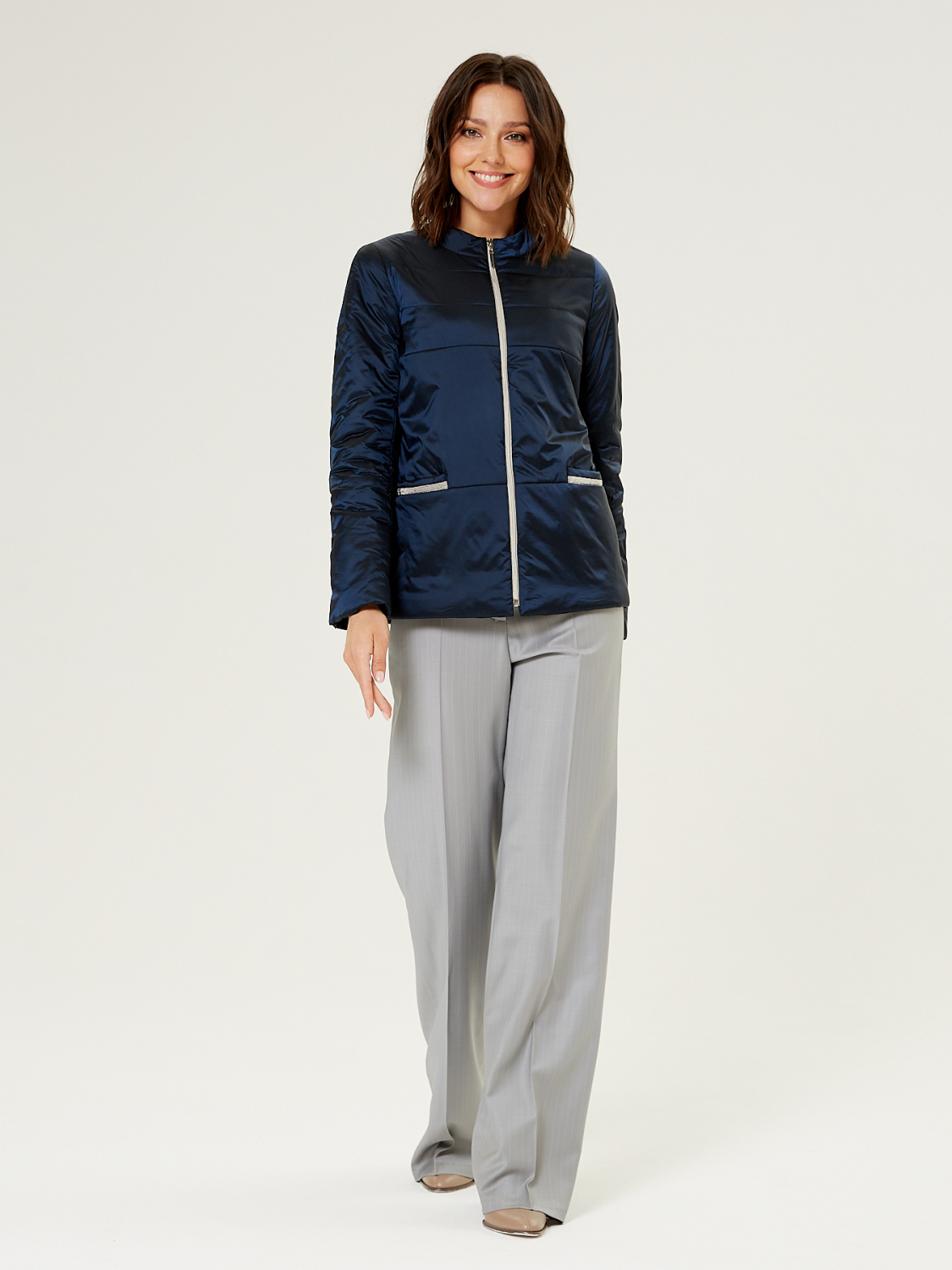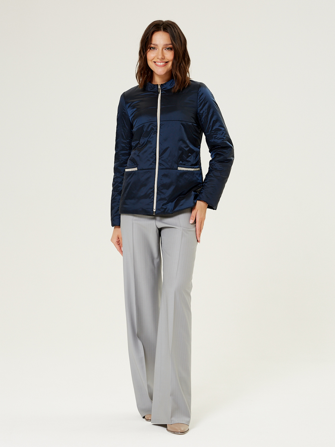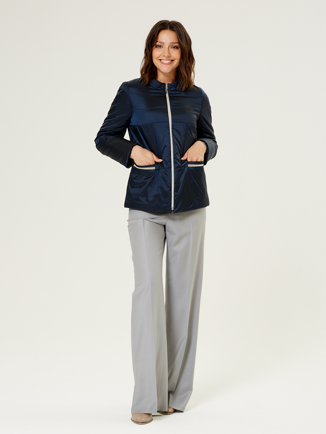 Демисезонная женская куртка полуприлегающего силуэта, дополненная итальянским утеплителем ValtherM. На полочках обработаны карманы с декоративной тесьмой. Для III роста длина изделия по спинке 64 cм.