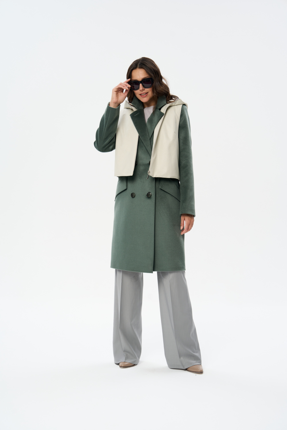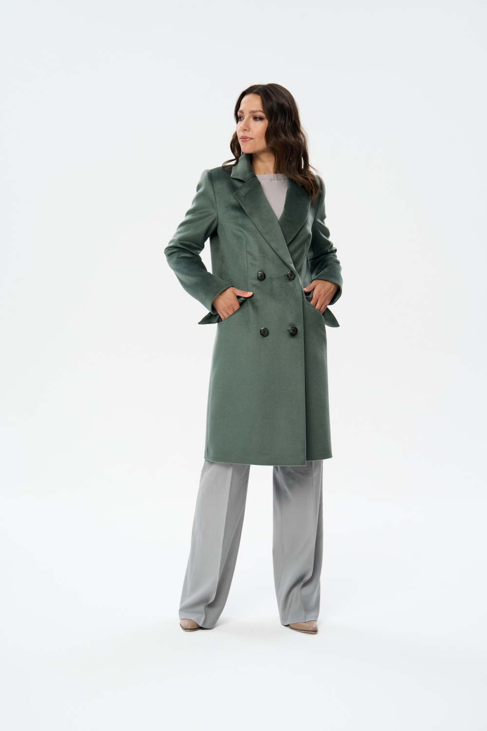 Женское демисезонное пальто из высококачественной вирджинской шерсти, полуприлегающего силуэта. Двубортное с застежкой на четыре пуговицы. Воротник отложной ,английский. Лацкан застегивается на пуговицу. При желании клапан можно убрать внутрь кармана ,в результате чего получается карман с листочкой.