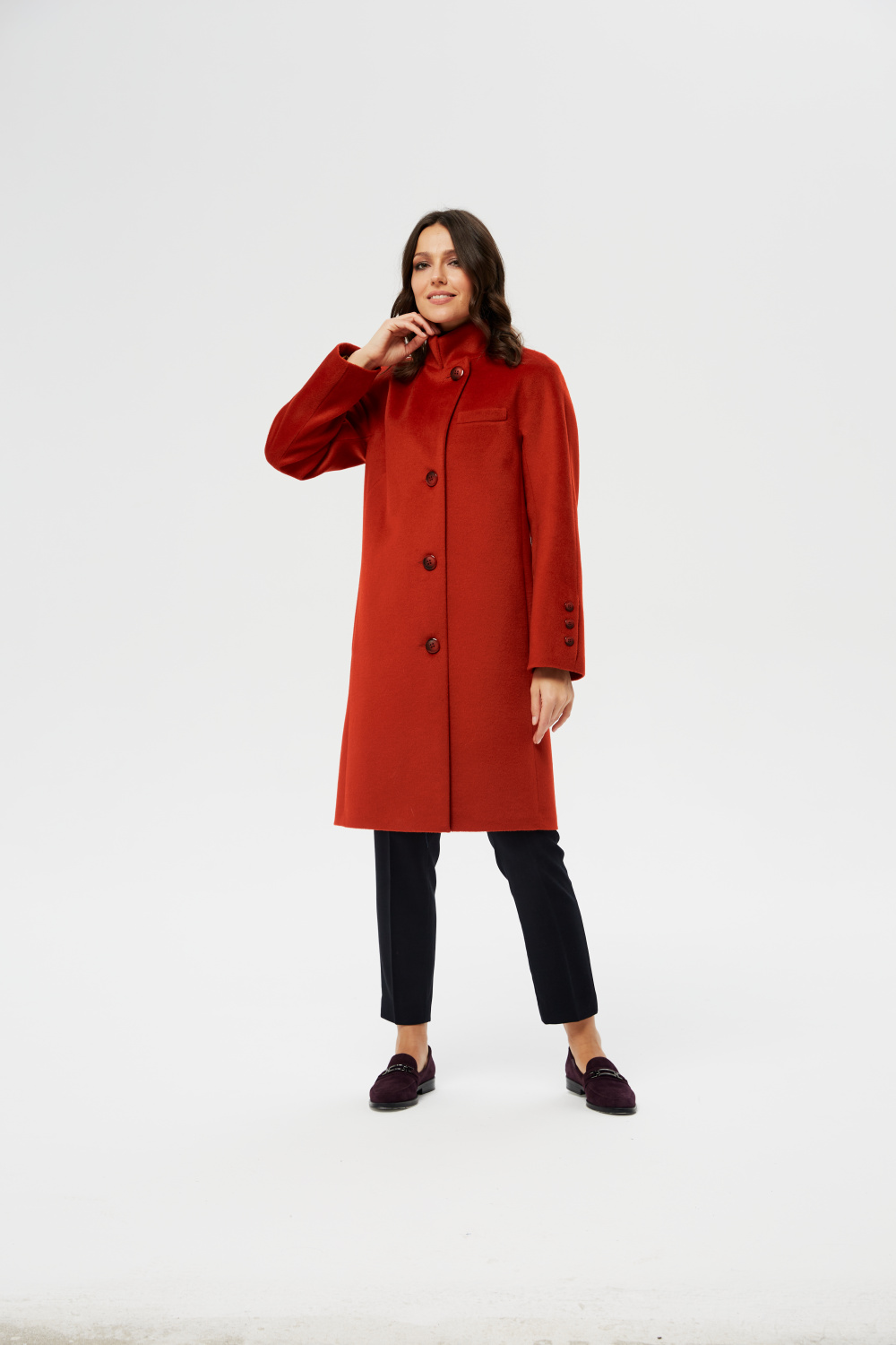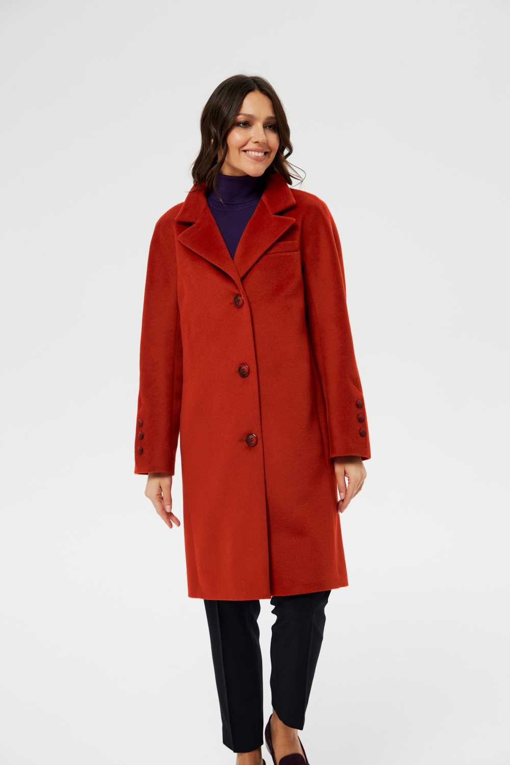 Однобортное женское демисезонное пальто прямого силуэта. Застежка на 4 пуговицы, Воротник  английский, застегивающийся в стойку. В рельефах полочек обработаны карманы. Спинка со шлицей.