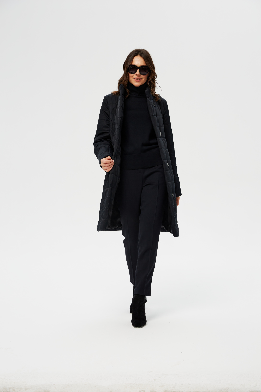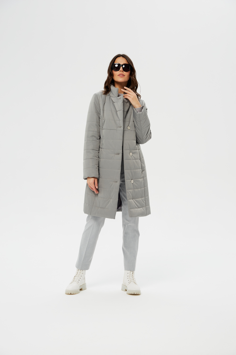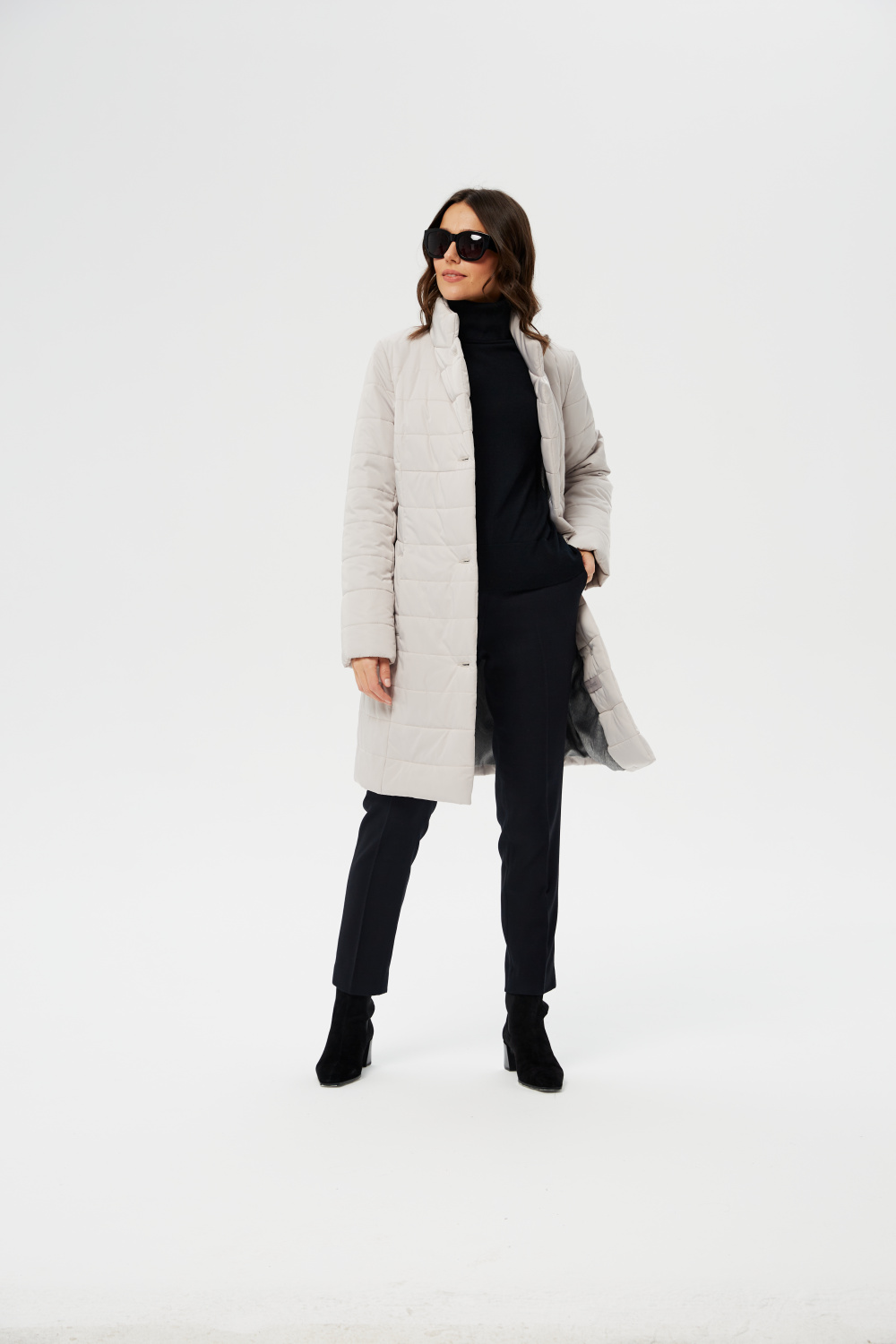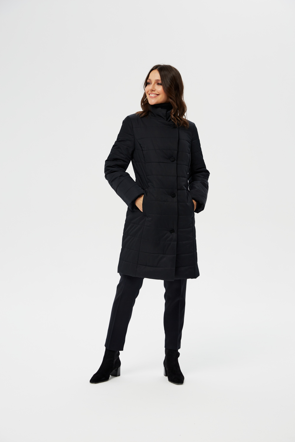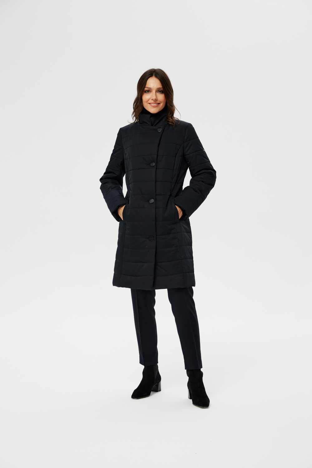 Женское приталенное пальто, утепленное итальянским высококачественным утеплителем ValtherM. Однобортное с застежкой на четыре пуговицы. Воротник стойка, раскладывающийся в английский. На полочках, в рельефах выполнены карманы на молнии. Длина рукава может регулироваться отворотом.