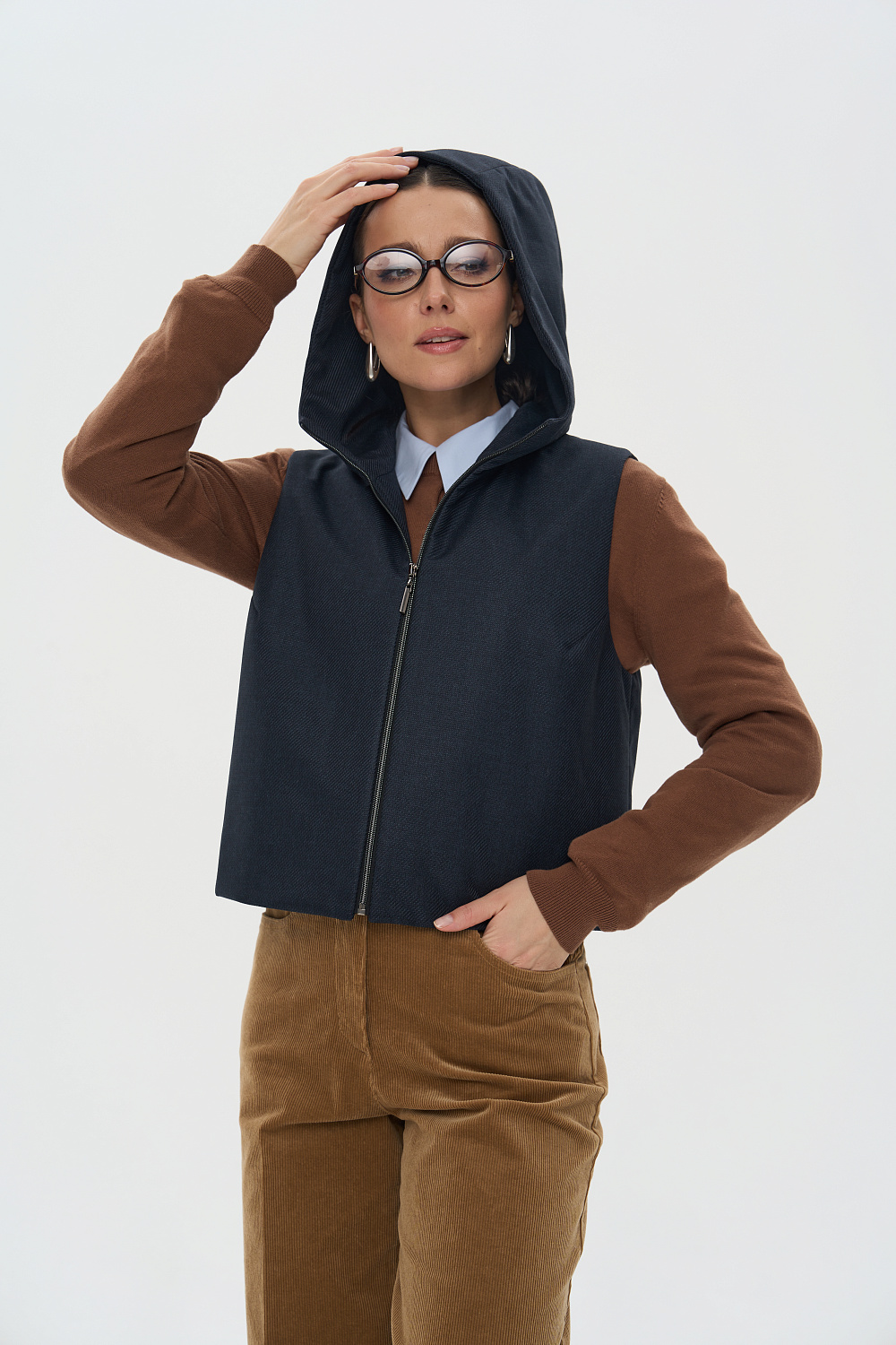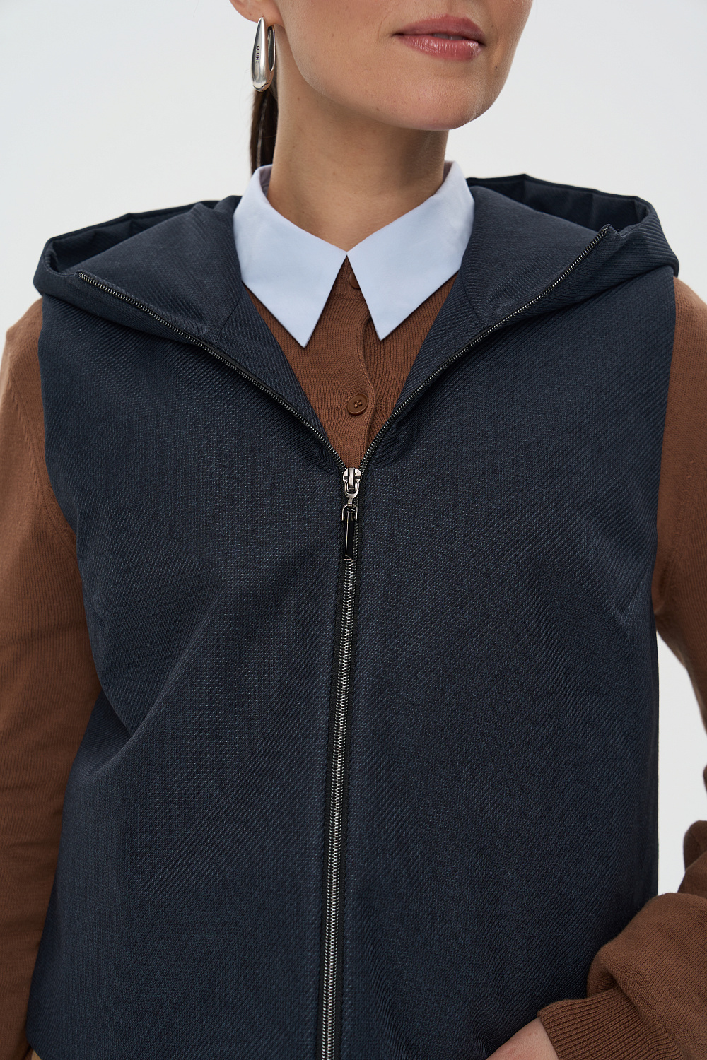Жилет женский дополнен удобной и элегантной молнией. Капюшон защитит Ваши волосы в дождливую погоду. Универсальный прямой силуэт позволяет носить жилетку, как поверх верхней одежды, так и под Ваше любимое пальто или куртку, в качестве дополнительного утепляющего слоя. В более теплую погоду жилетка прекрасно впишется и в повседневный, и в элегантный образы.