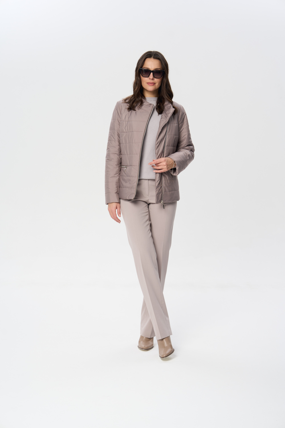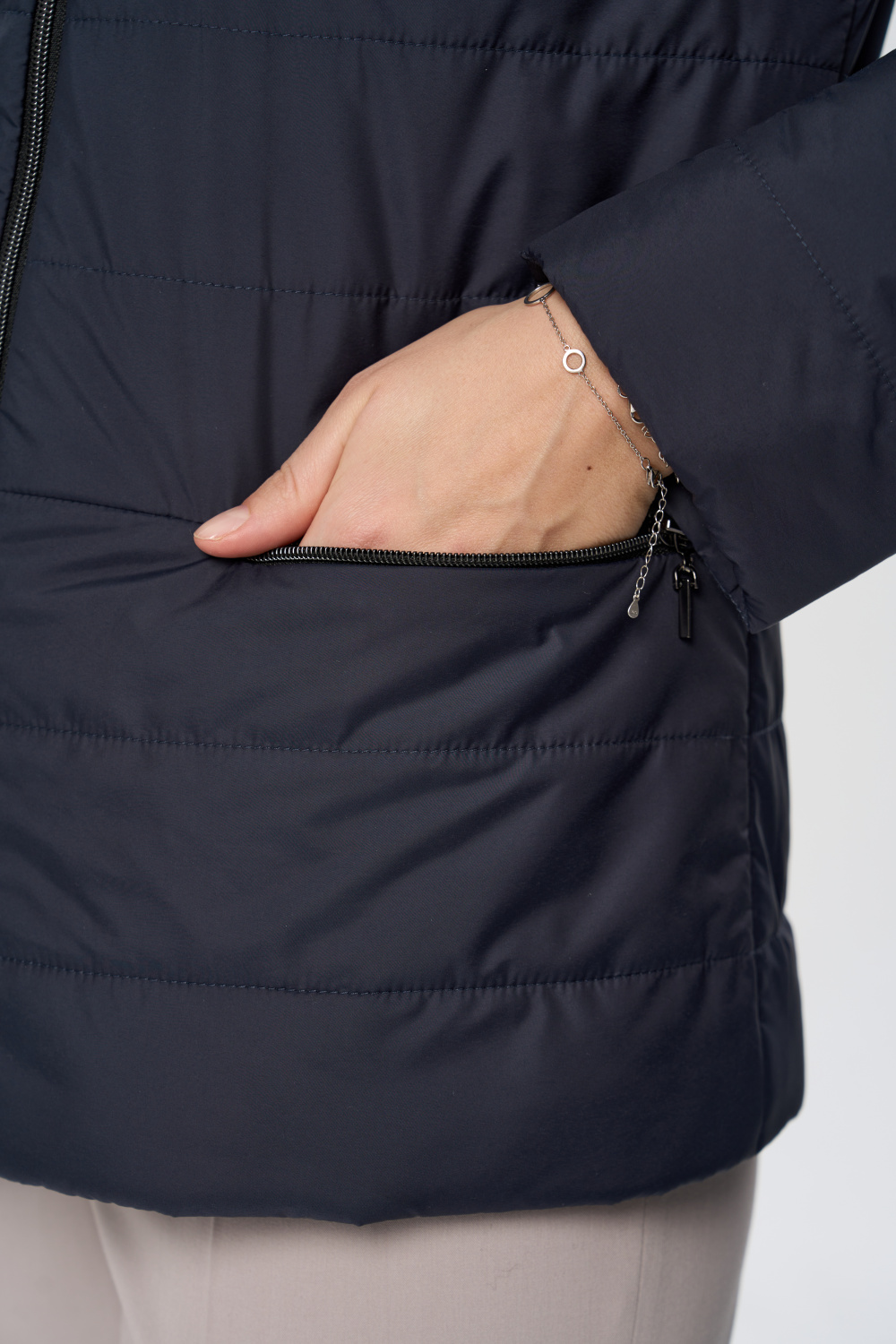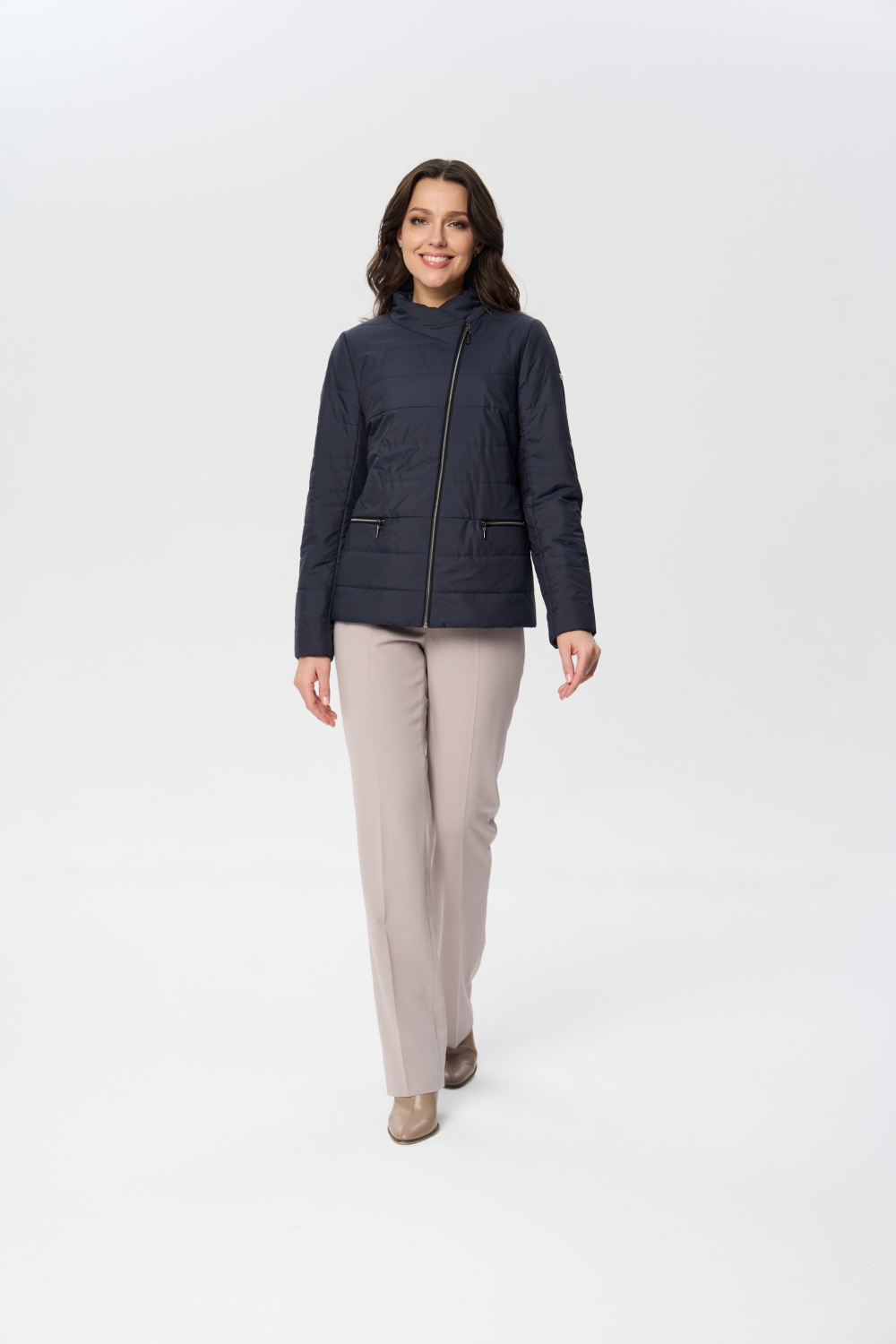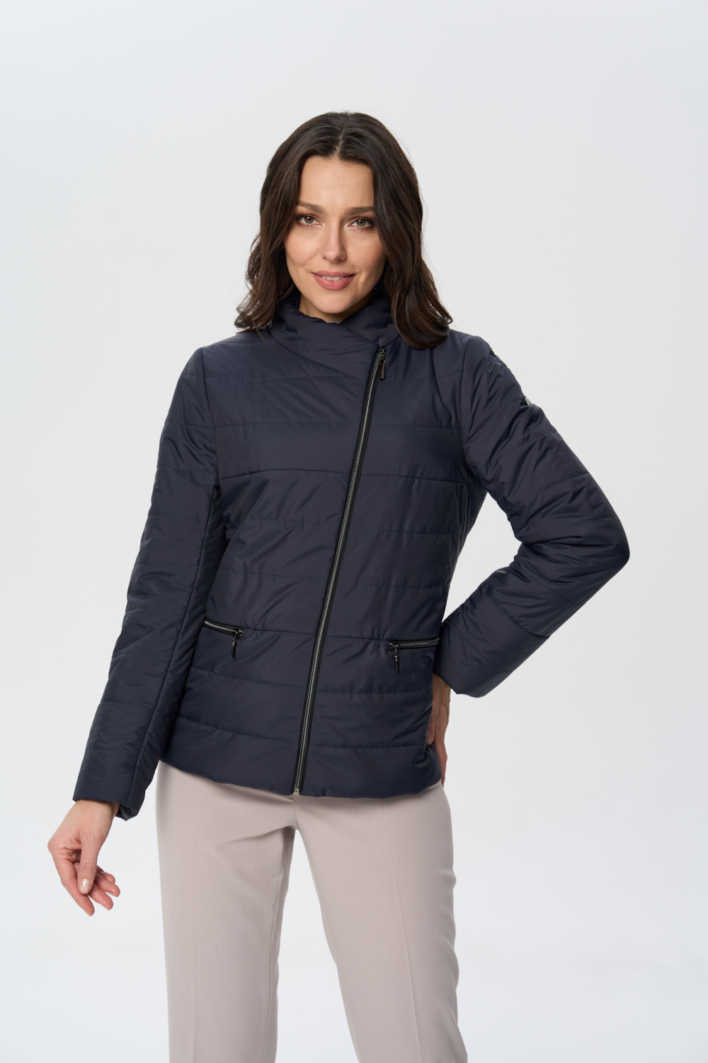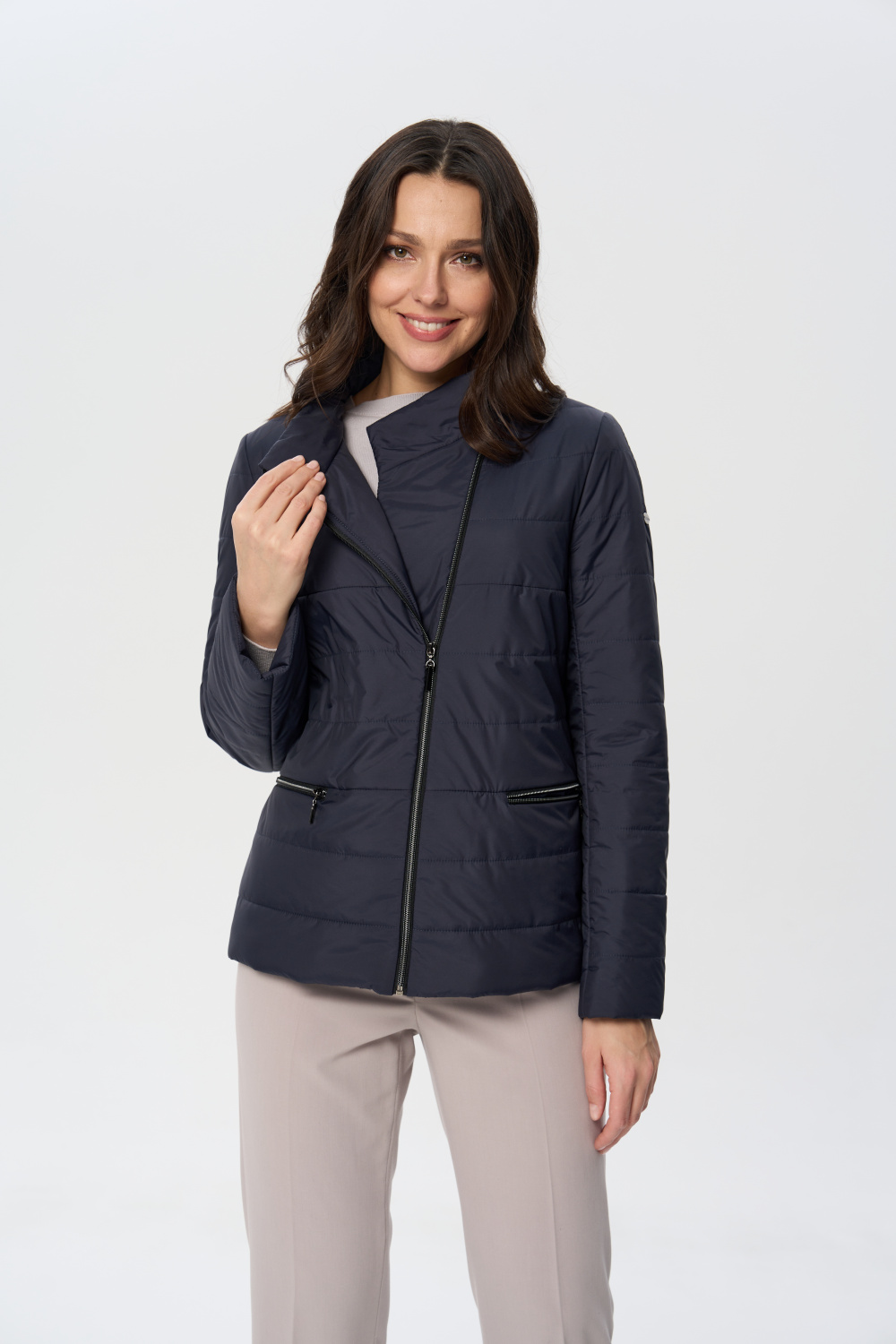 Куртка весенняя женская прилегающего силуэта на молнии с воротником стойкой. На полочках обработаны удобные карманы на молнии. Длина рукава может регулироваться отворотом.