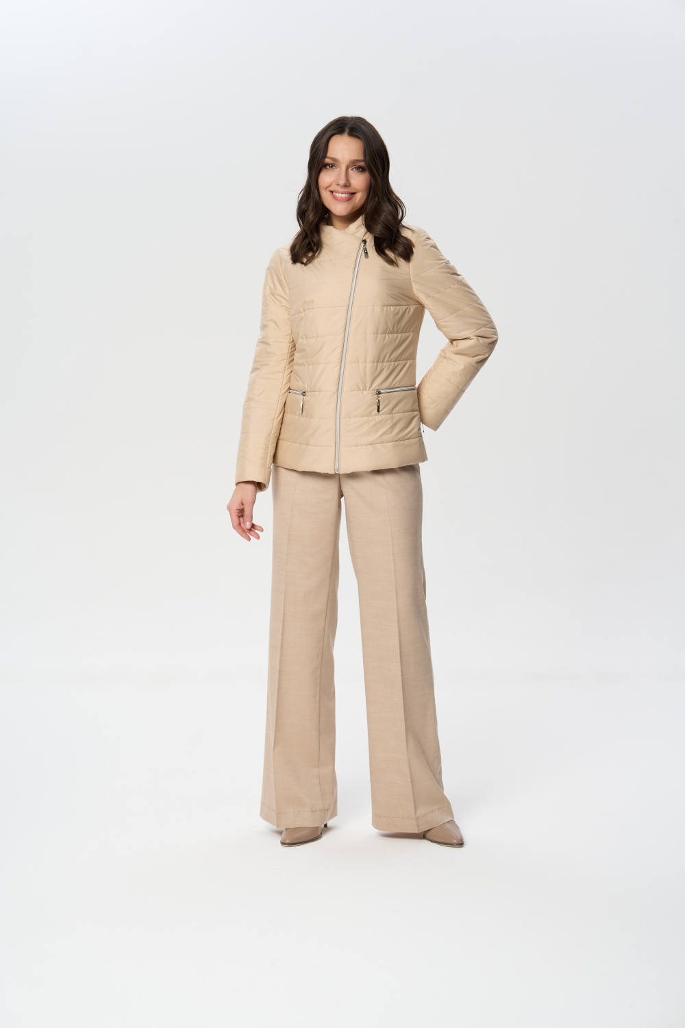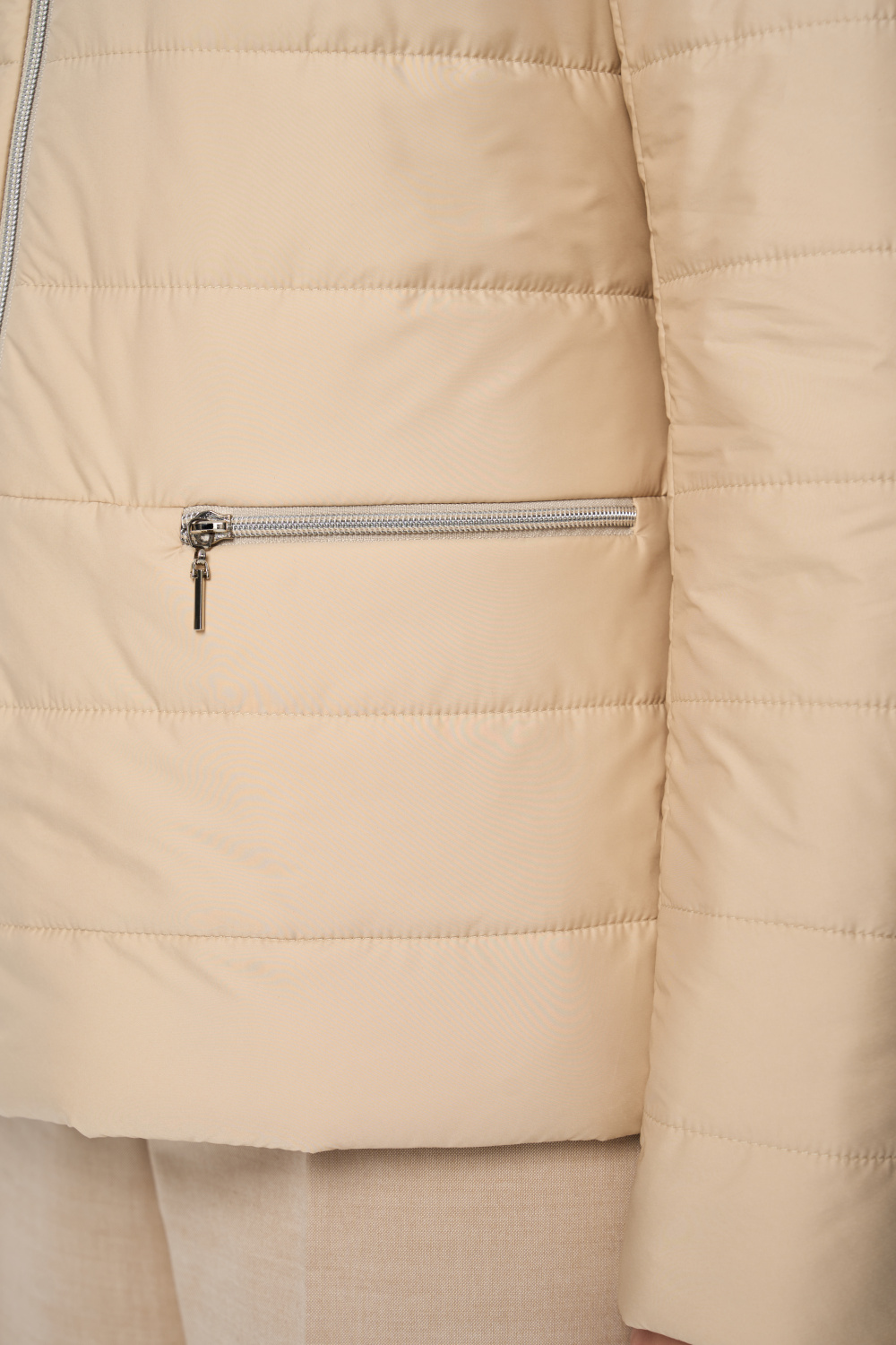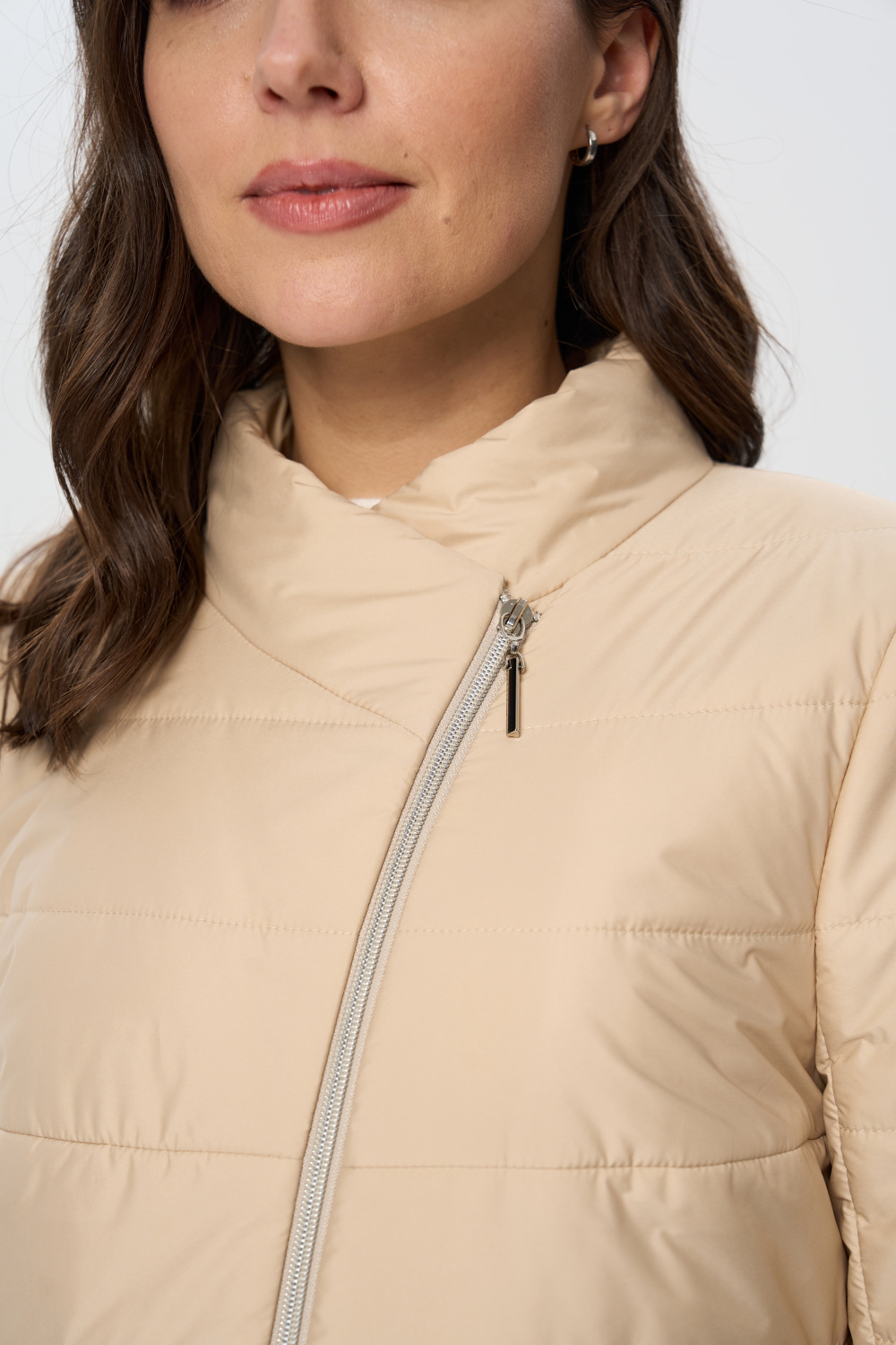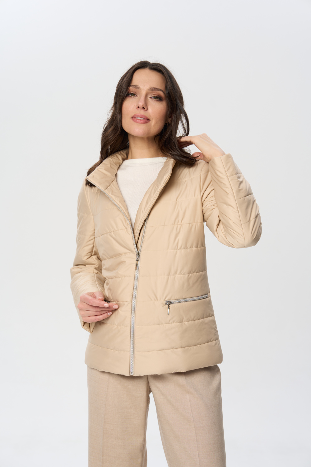 Куртка весенняя женская прилегающего силуэта на молнии с воротником стойкой. На полочках обработаны удобные карманы на молнии. Длина рукава может регулироваться отворотом.