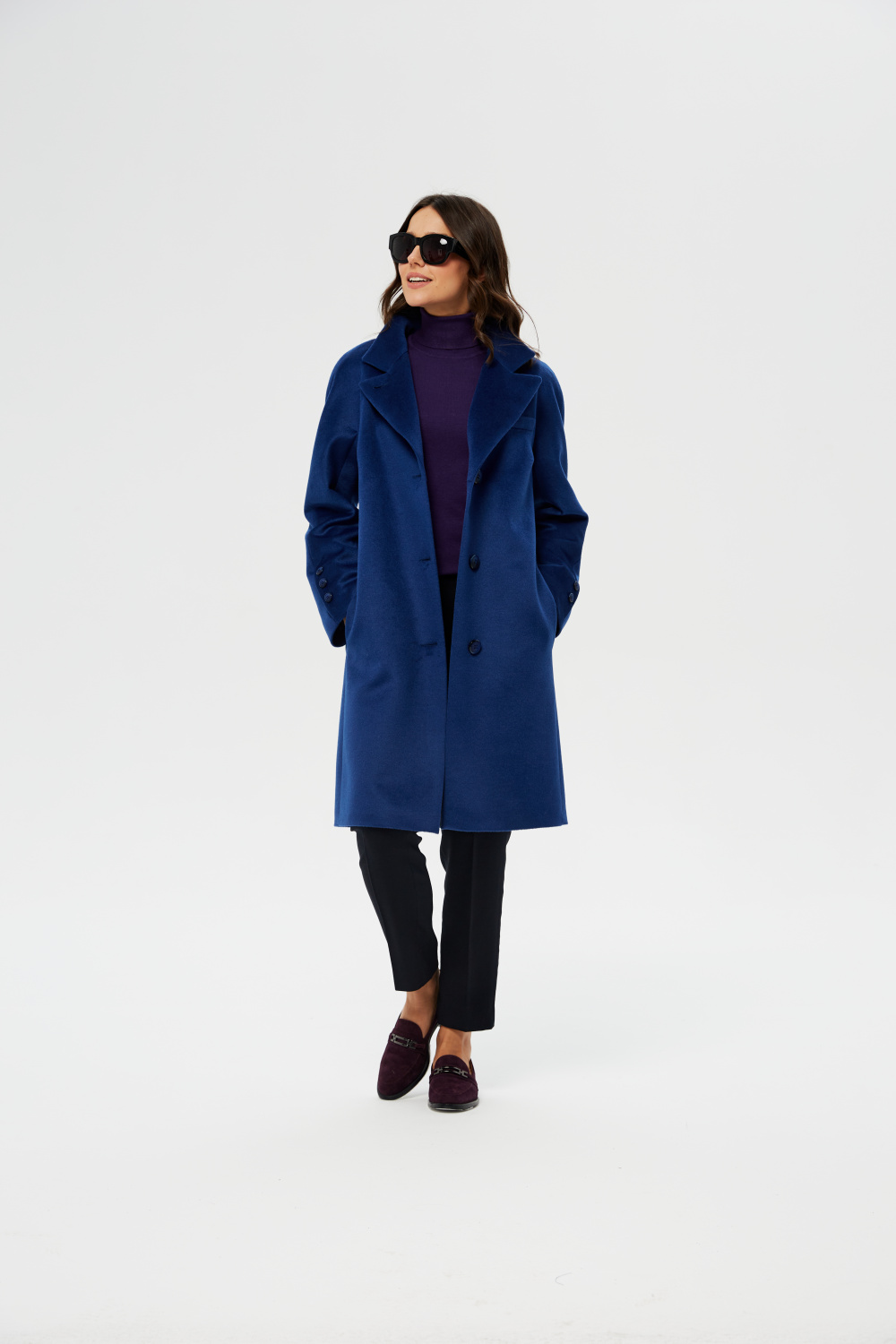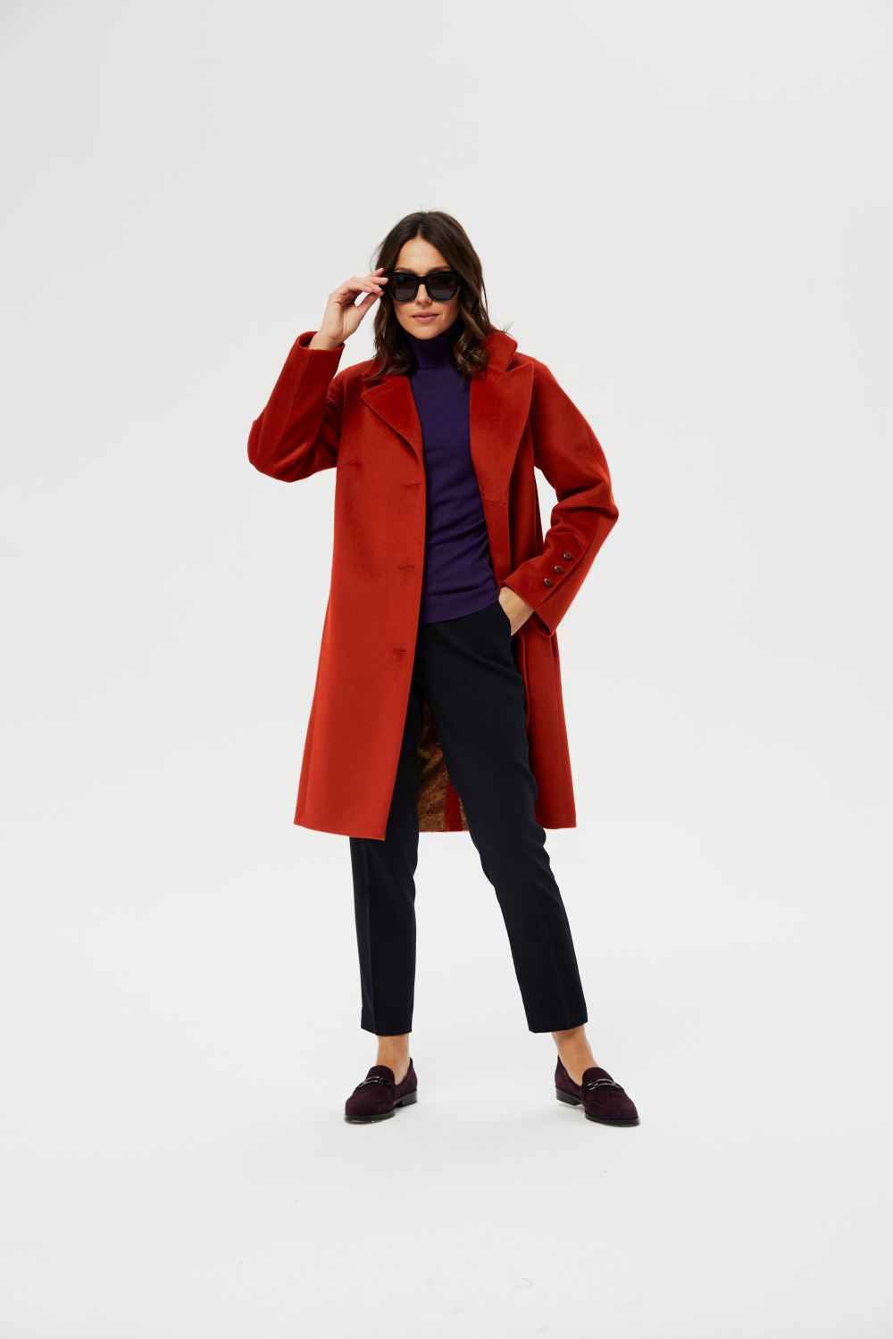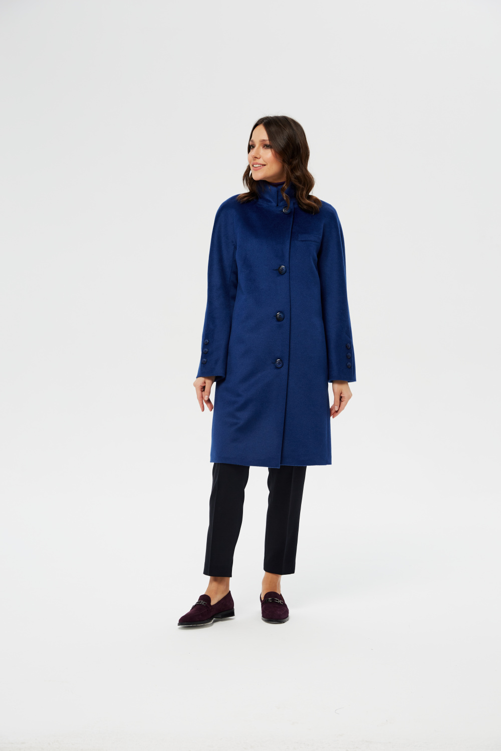 Однобортное женское демисезонное пальто прямого силуэта. Застежка на 4 пуговицы, Воротник  английский, застегивающийся в стойку. В рельефах полочек обработаны карманы. Спинка со шлицей.
