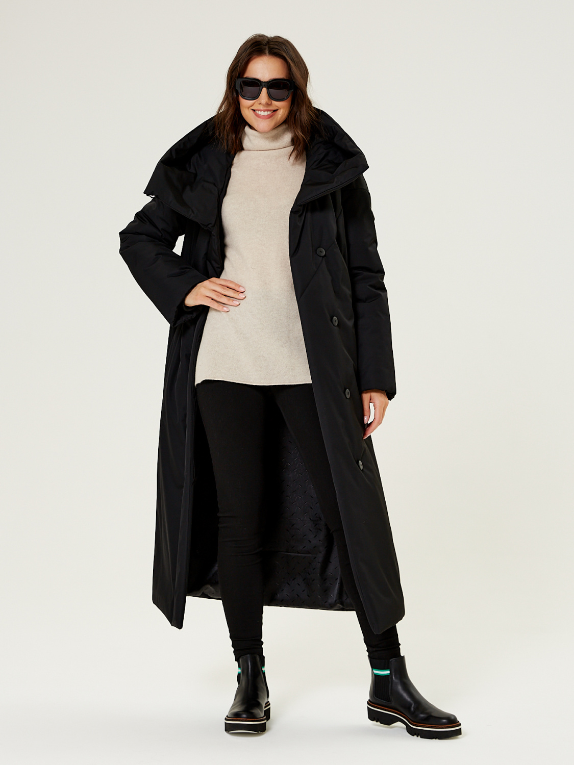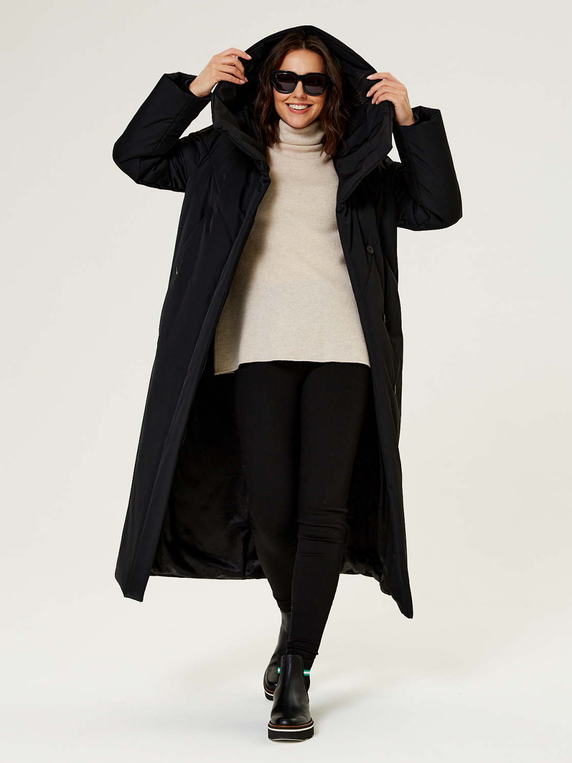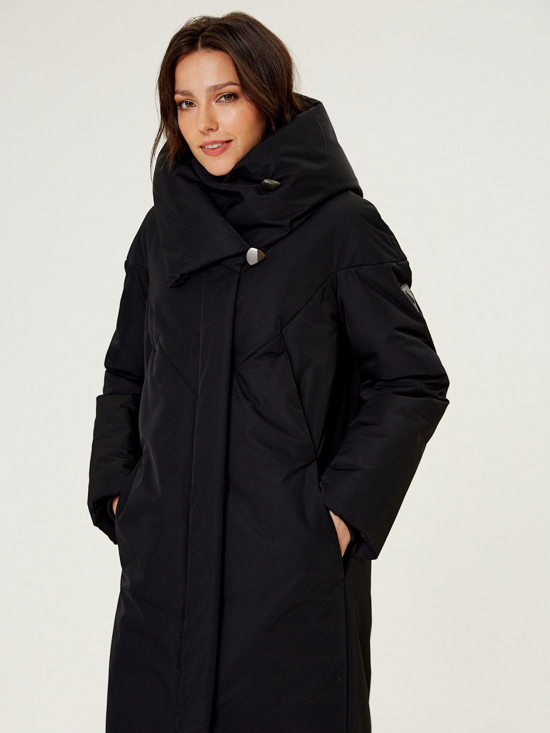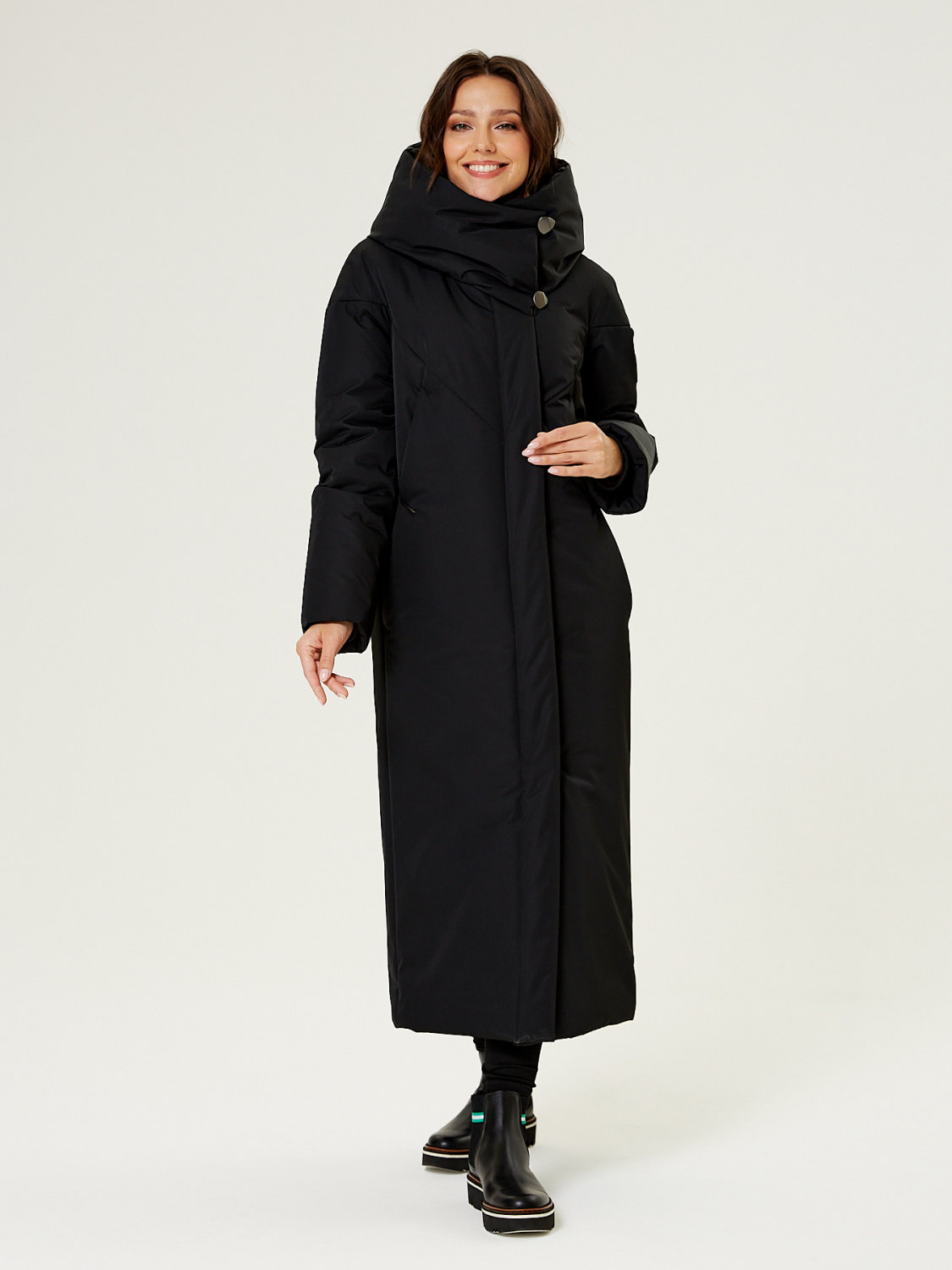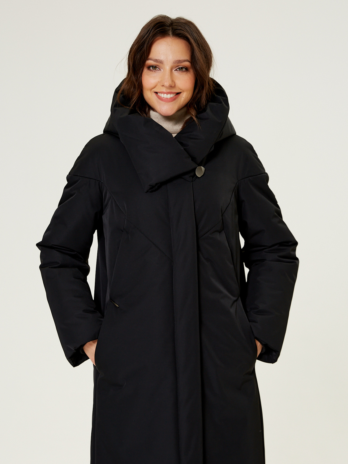 Прямой силует. Однобортное пальто с супатной застежкой. На полочках обработаны по два кармана. Низ рукавов обработан манжетами, для сохранения тепла вашего тела. Модный фасонный капюшон трансформируется в объемную стойку.