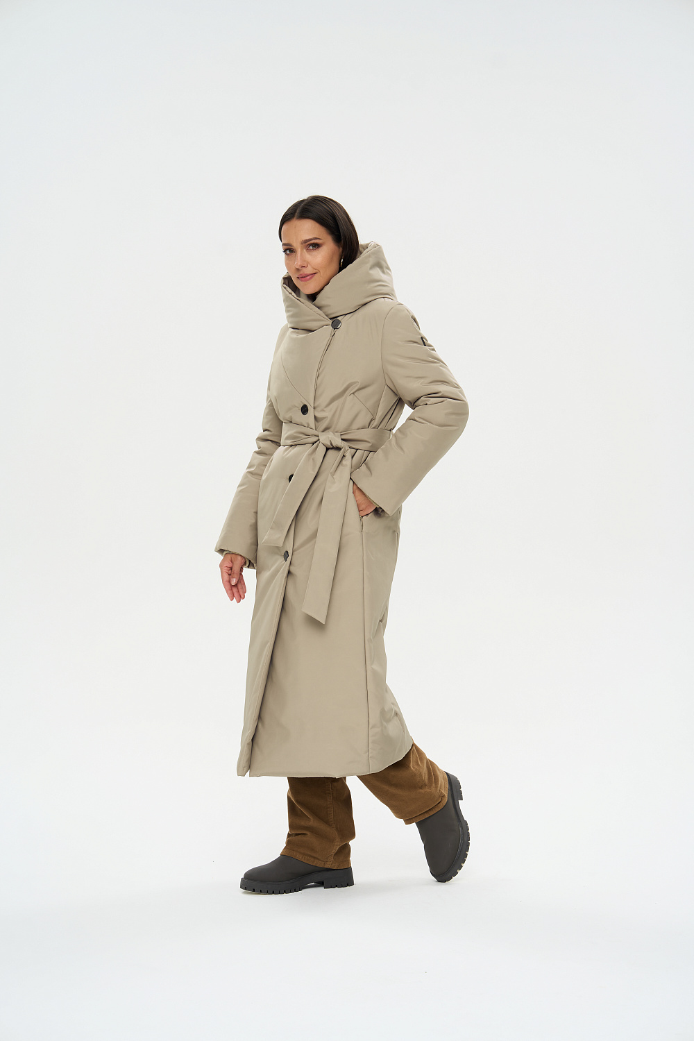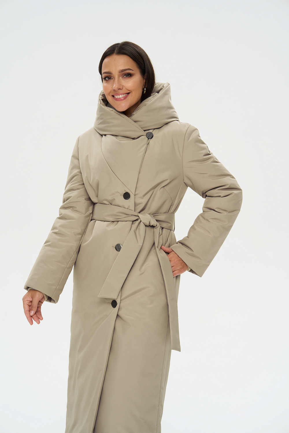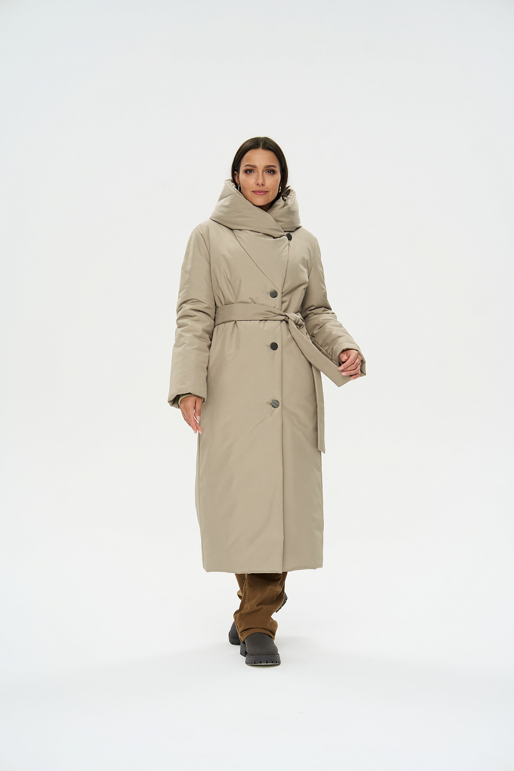 Пальто зимнее женское прямого силуэта, однобортное, застегивающаяся на 4 пуговицы. От ветренной погоды Вас защитит регулируемый фасонный капюшон, который трансформируется в объемную стойку. На полочках обработаны удобные карманы в шве на молнии. Длина рукава может регулироваться отворотом. Зимнее женское пальто оптимальной длины ниже колена позволяет сочетать его с любыми предметами Вашего гардероба. К пальто прилагается пояс.