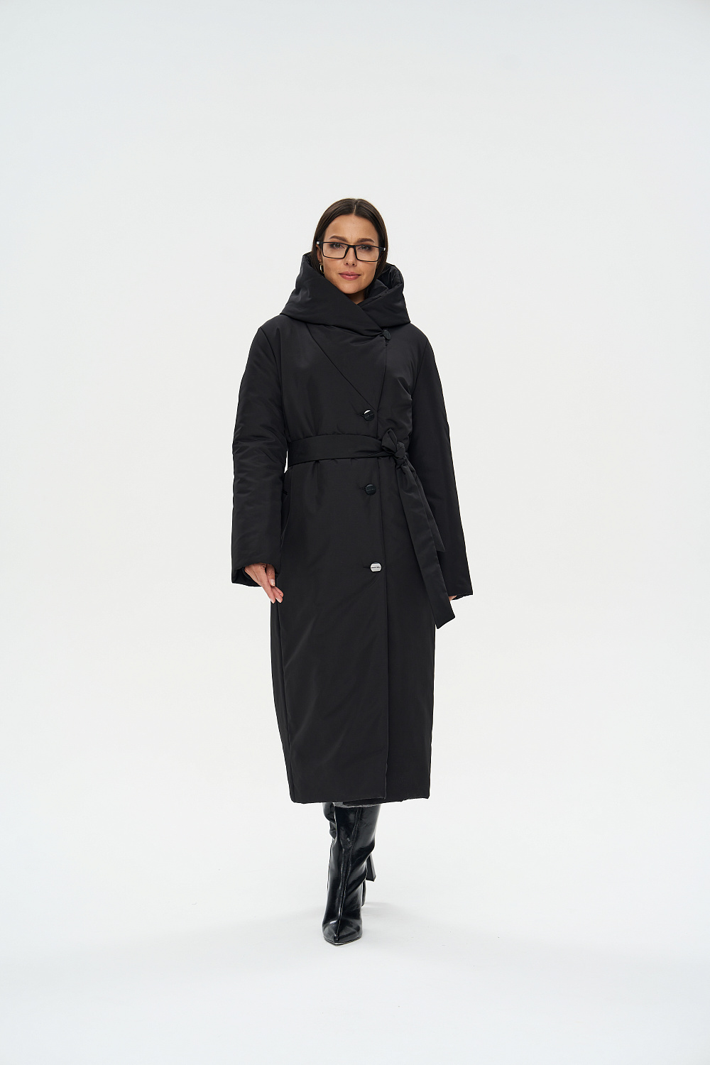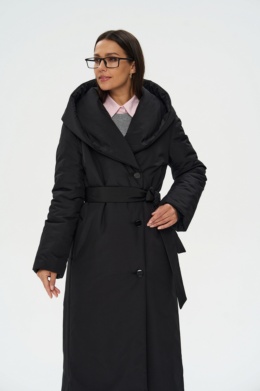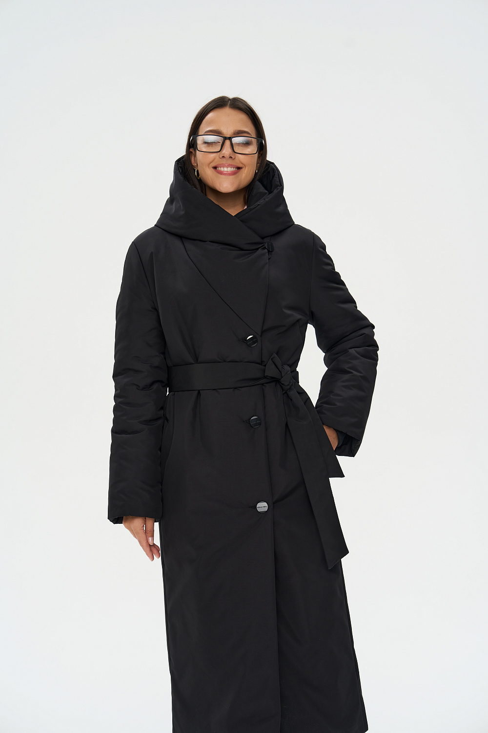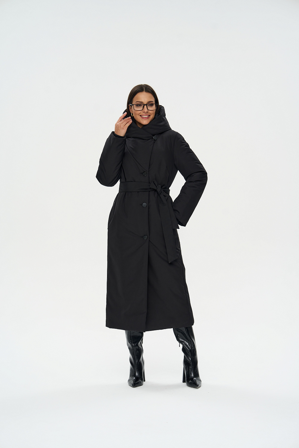Пальто зимнее женское прямого силуэта, однобортное, застегивающаяся на 4 пуговицы. От ветренной погоды Вас защитит регулируемый фасонный капюшон, который трансформируется в объемную стойку. На полочках обработаны удобные карманы в шве на молнии. Длина рукава может регулироваться отворотом. Зимнее женское пальто оптимальной длины ниже колена позволяет сочетать его с любыми предметами Вашего гардероба. К пальто прилагается пояс.