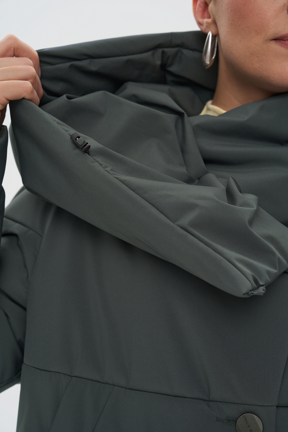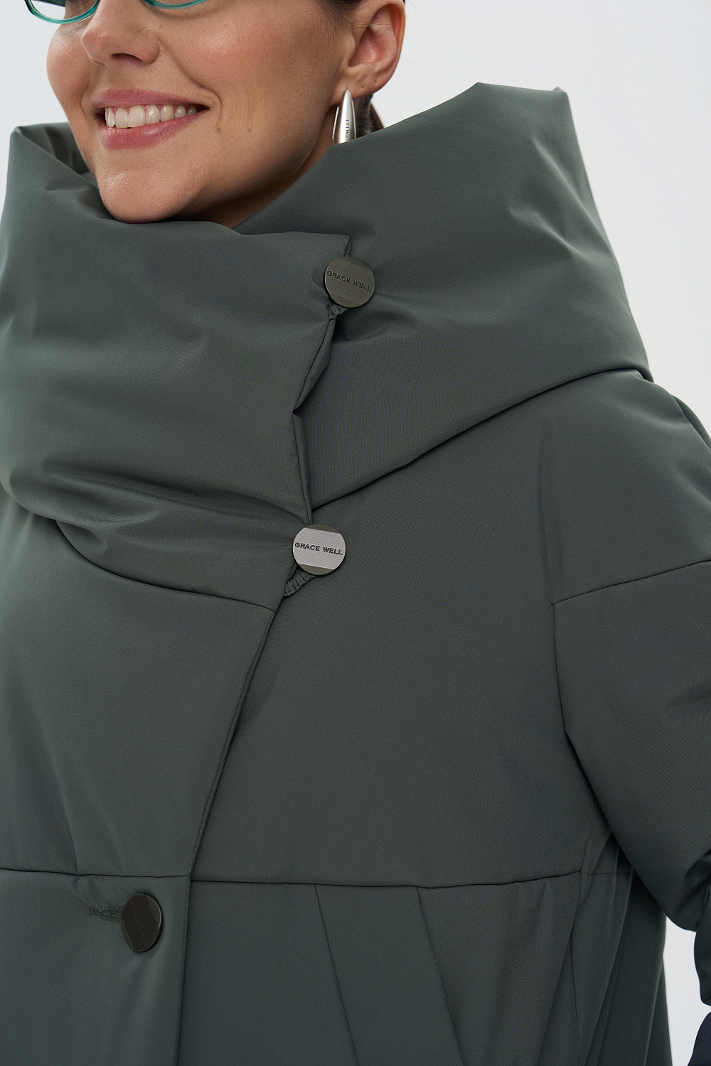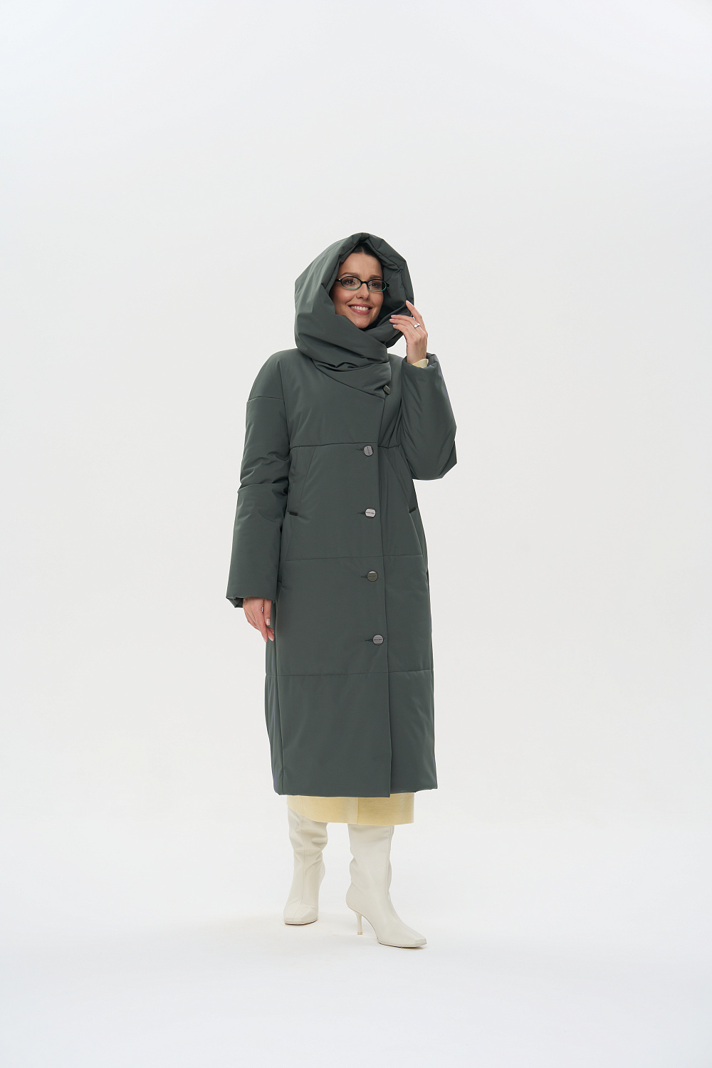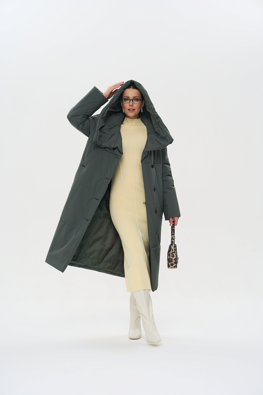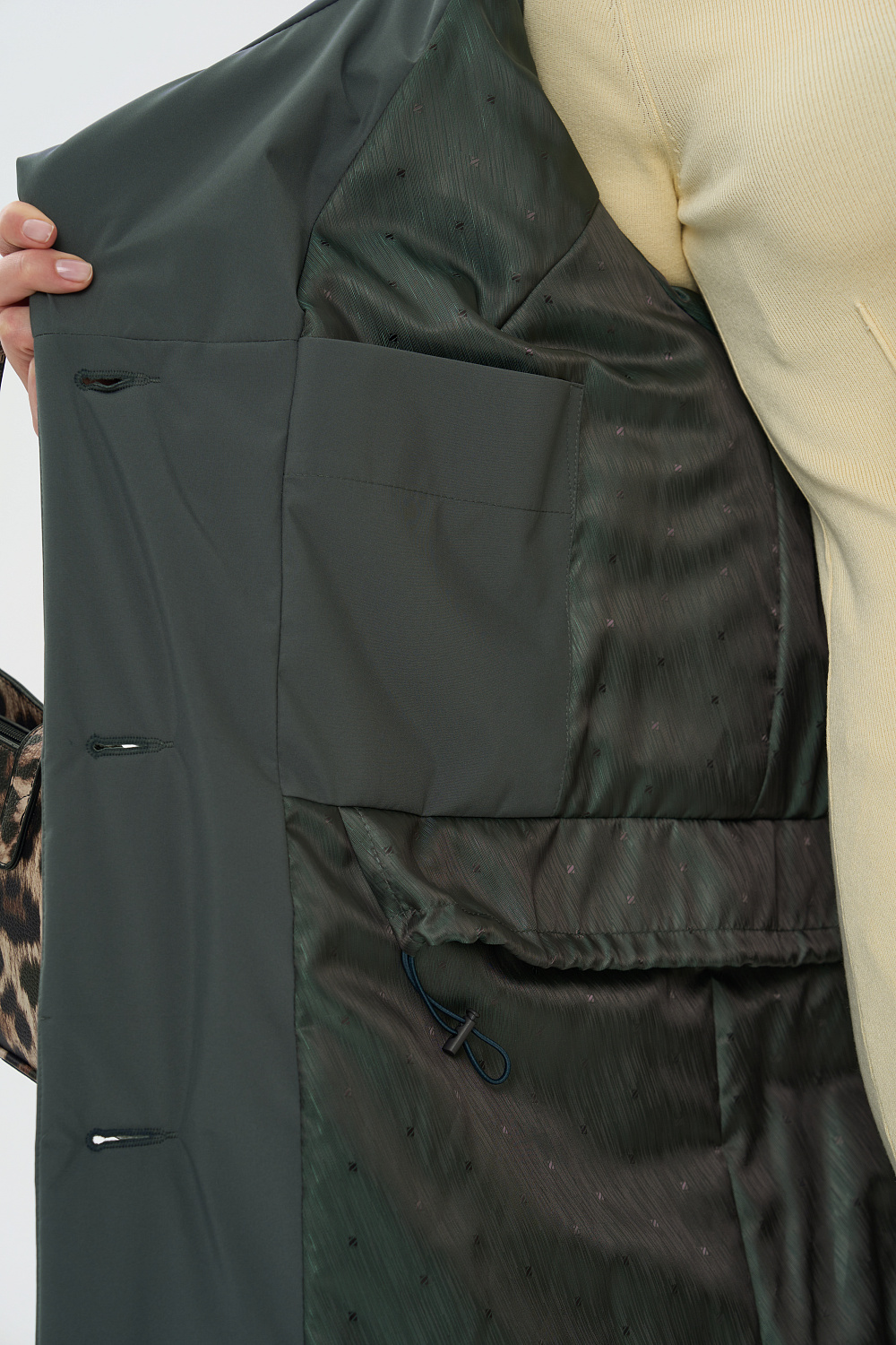 - Функциональные детали: поливискозная жаккардовая подкладка; застежки на 6 пуговиц; фасонный капюшон, который трансформируется в объемную стойку; карманы листочкой (на магнитах); регулируемая длина рукава (за счет отворотов), объем талии и капюшона (за счет кулиски).