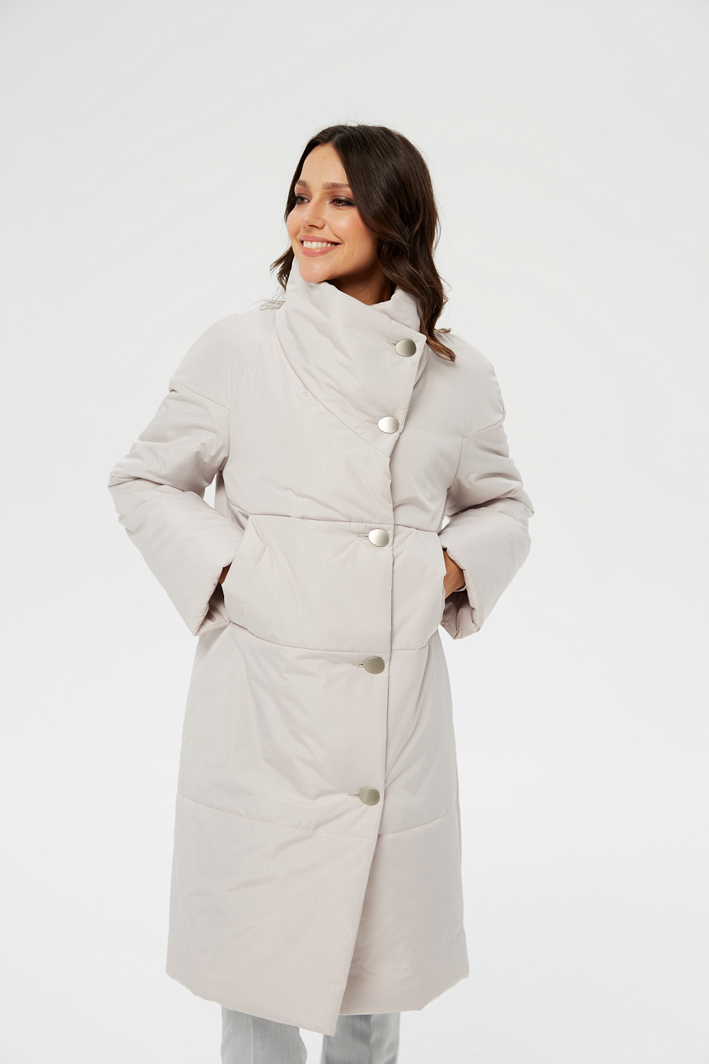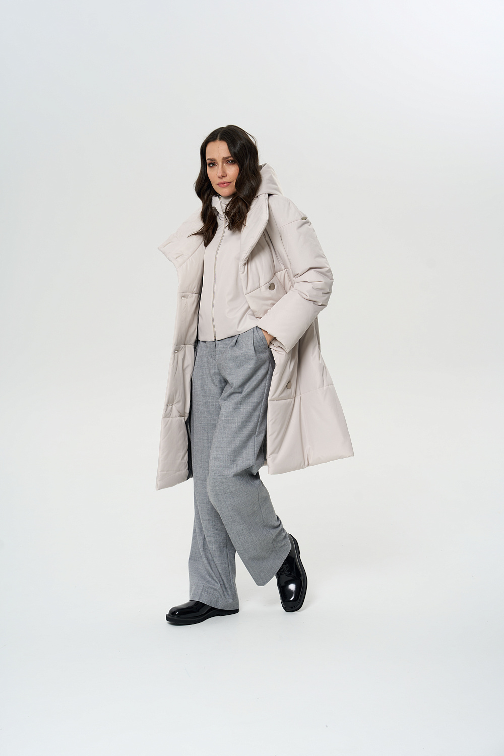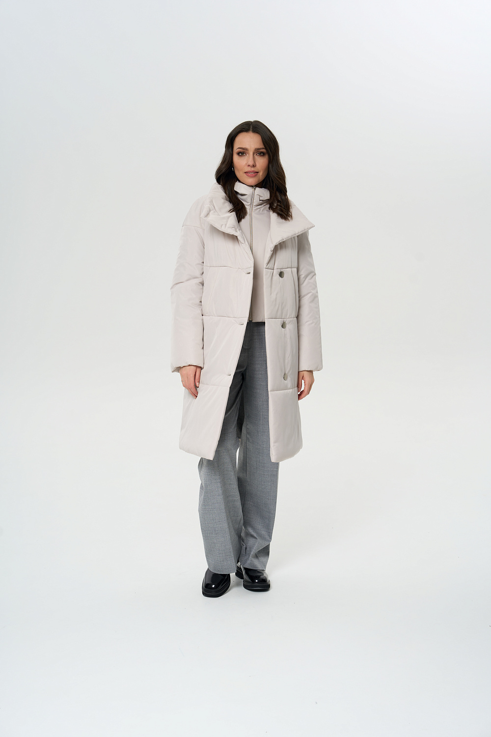 Пальто прямого силуэта, однобортное, с застежками на 5 пуговиц. Воротник - фасонная стойка апаш. На полочках обработаны удобные карманы листочкой (на магнитах). Длина рукава может регулироваться отворотом. Пальто демисезонное женское оптимальной длины ниже колена (98 см) позволяет сочетать его с любыми предметами Вашего гардероба. Выпускается в двух ростах: в среднем (164-170 см, III) и высоком росте (170-176, IV).