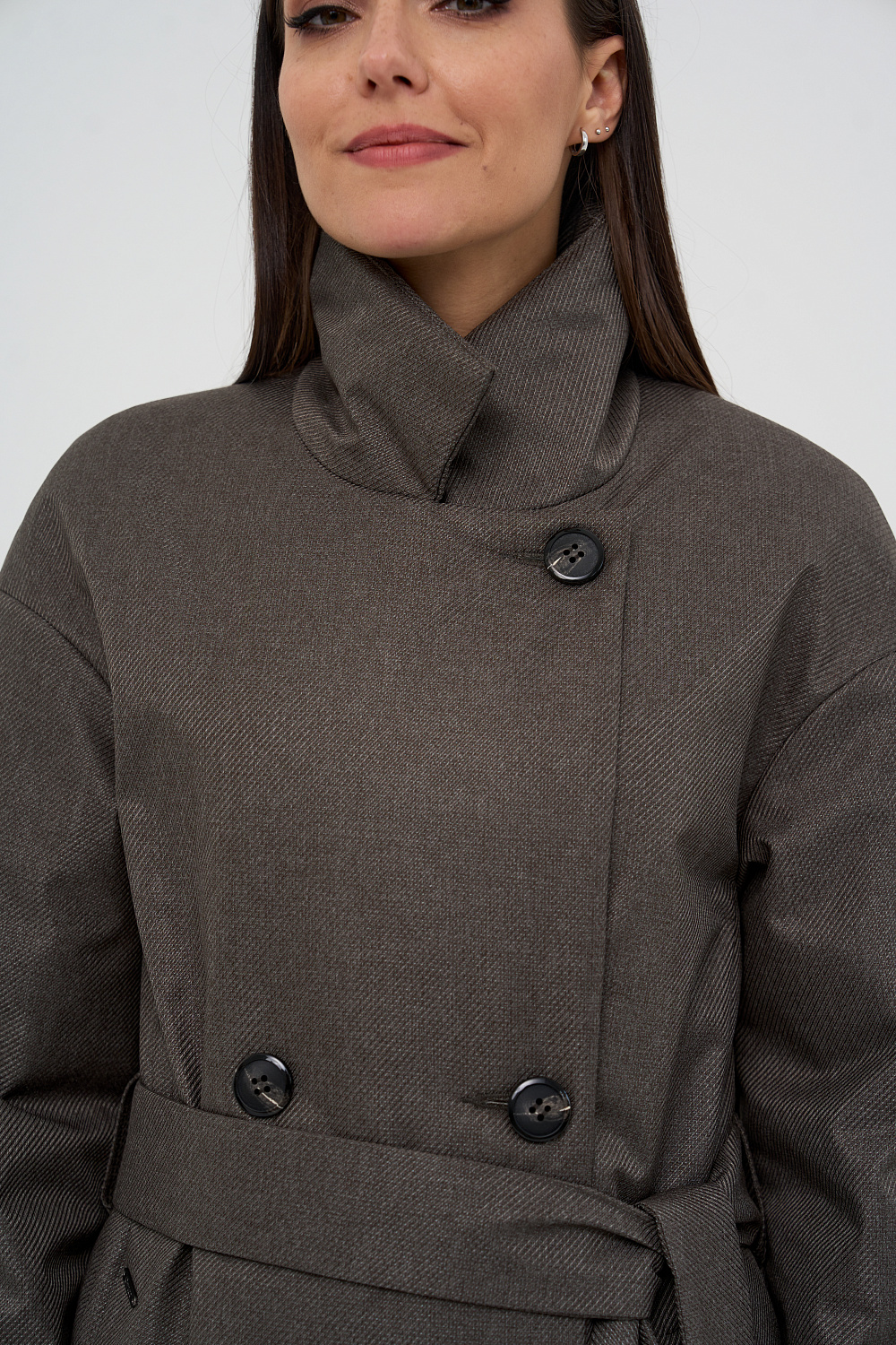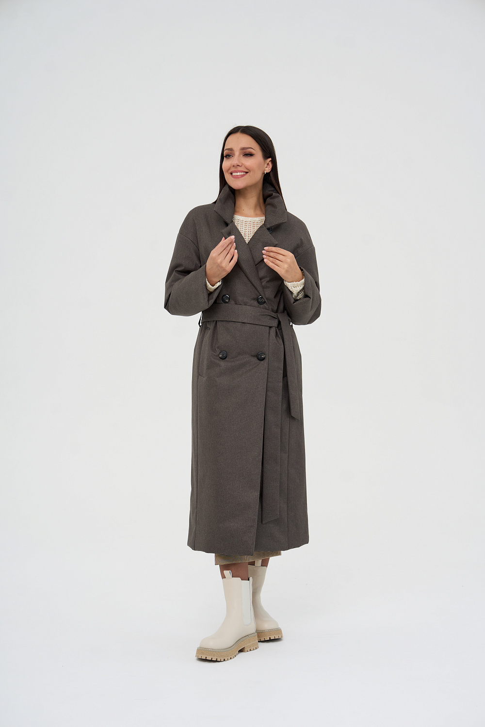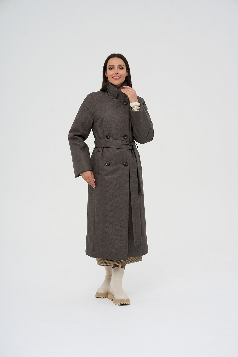 Пальто, утепленное женское прямого силуэта, двубортное, с застежками на 4 основные пуговицы и 1 супатную. Воротник – английский отложной, застегивающийся в стойку. На полочках обработаны удобные карманы в шве. Длина рукава может регулироваться отворотом. Женское пальто длины ниже колена (119 см) позволяет сочетать его с любыми предметами Вашего гардероба. Выпускается в двух ростах: в среднем (164-170 см, III) и высоком росте (170-176, IV).