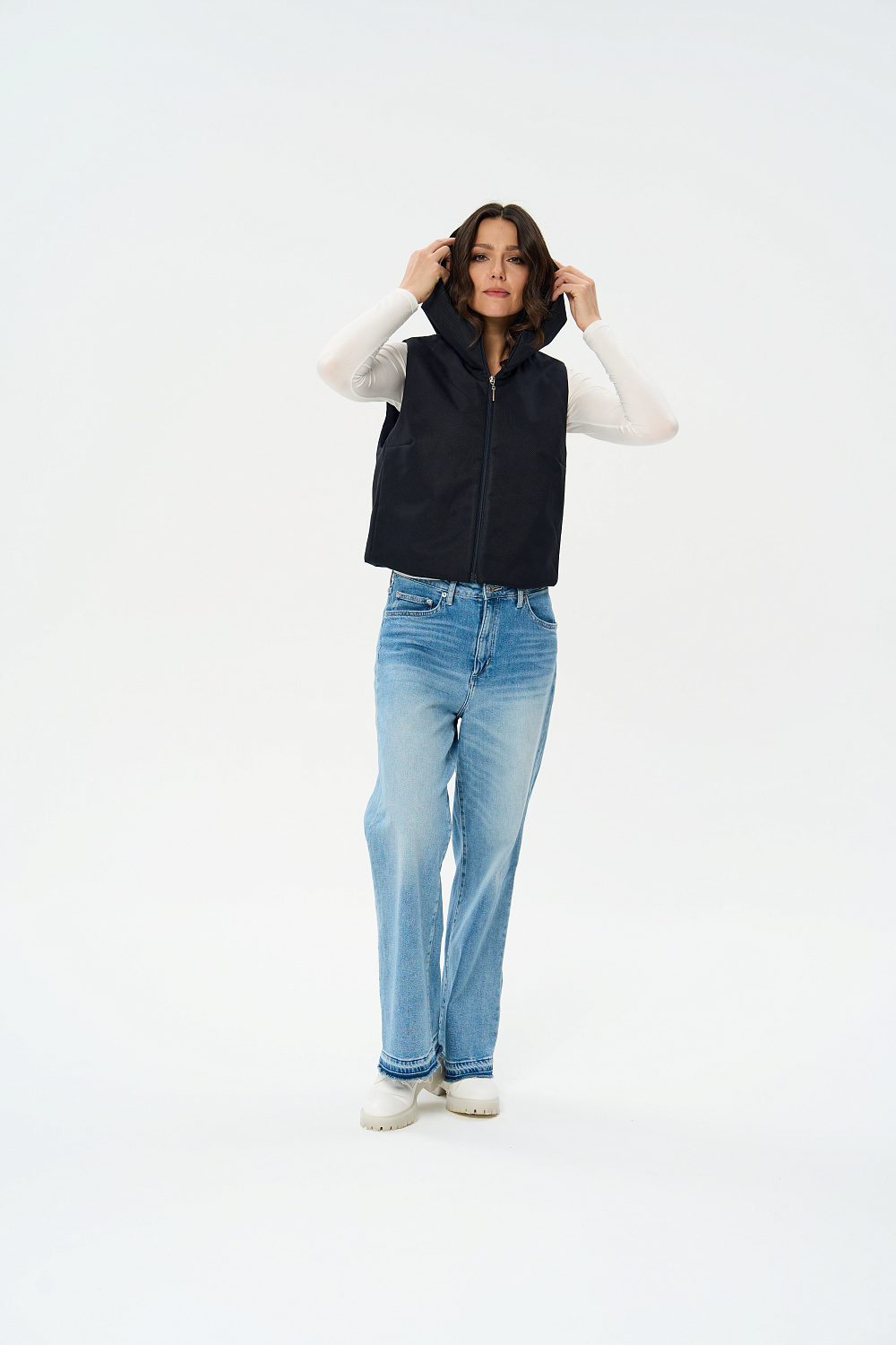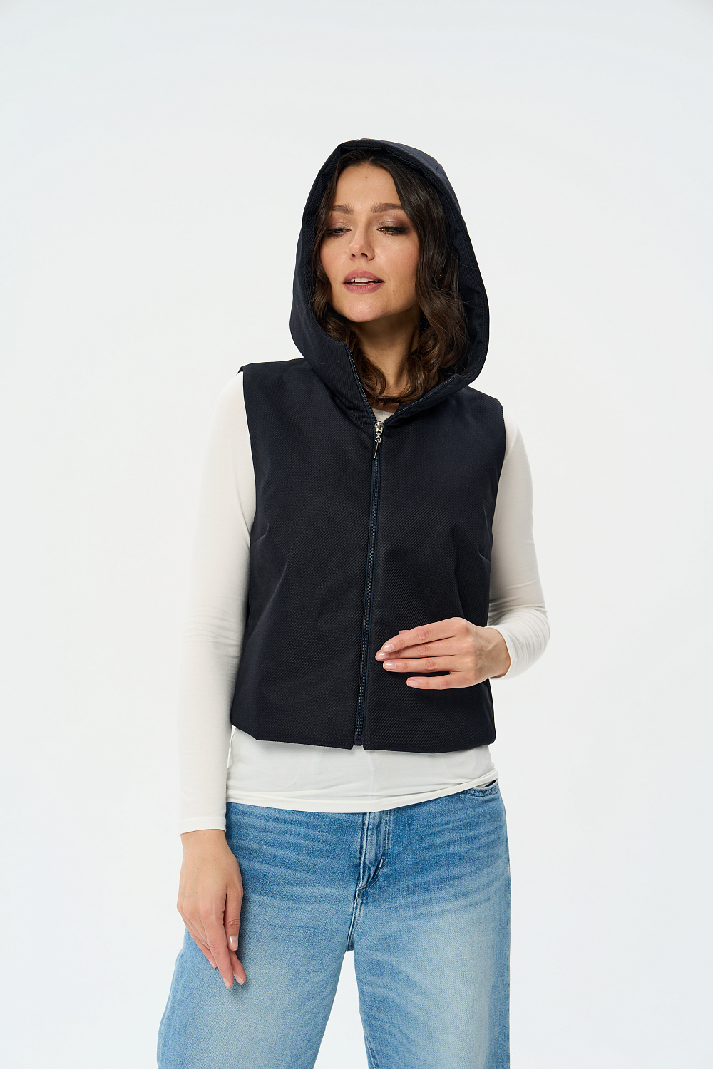 Жилет женский дополнен удобной и элегантной молнией. Капюшон защитит Ваши волосы в дождливую погоду. Универсальный прямой силуэт позволяет носить жилетку, как поверх верхней одежды, так и под Ваше любимое пальто или куртку, в качестве дополнительного утепляющего слоя. В более теплую погоду жилетка прекрасно впишется и в повседневный, и в элегантный образы.