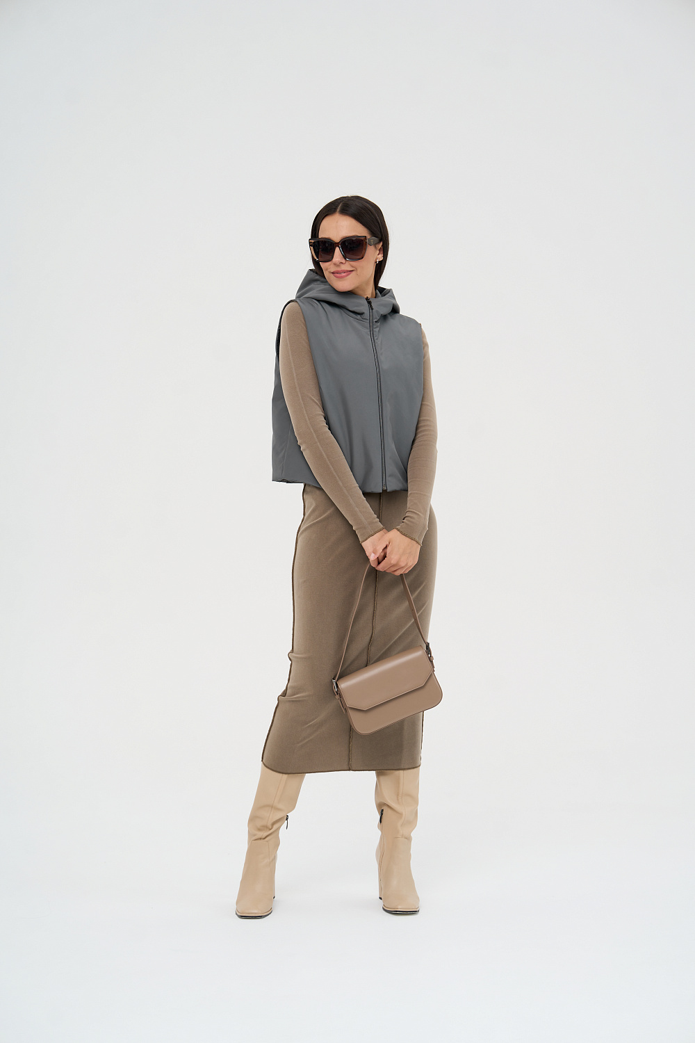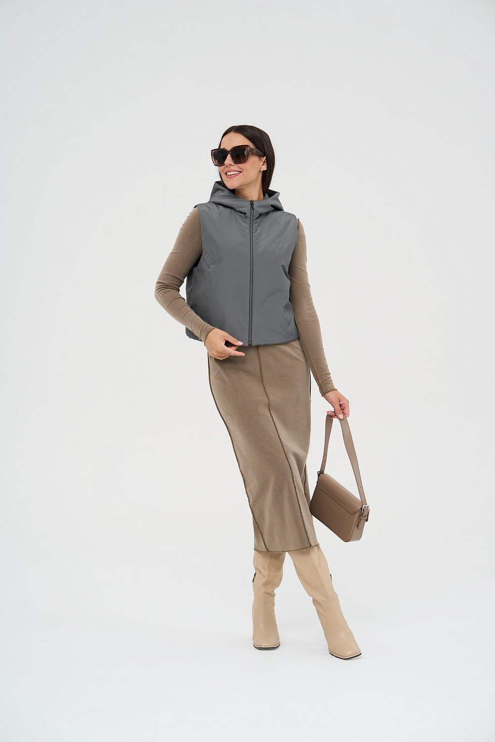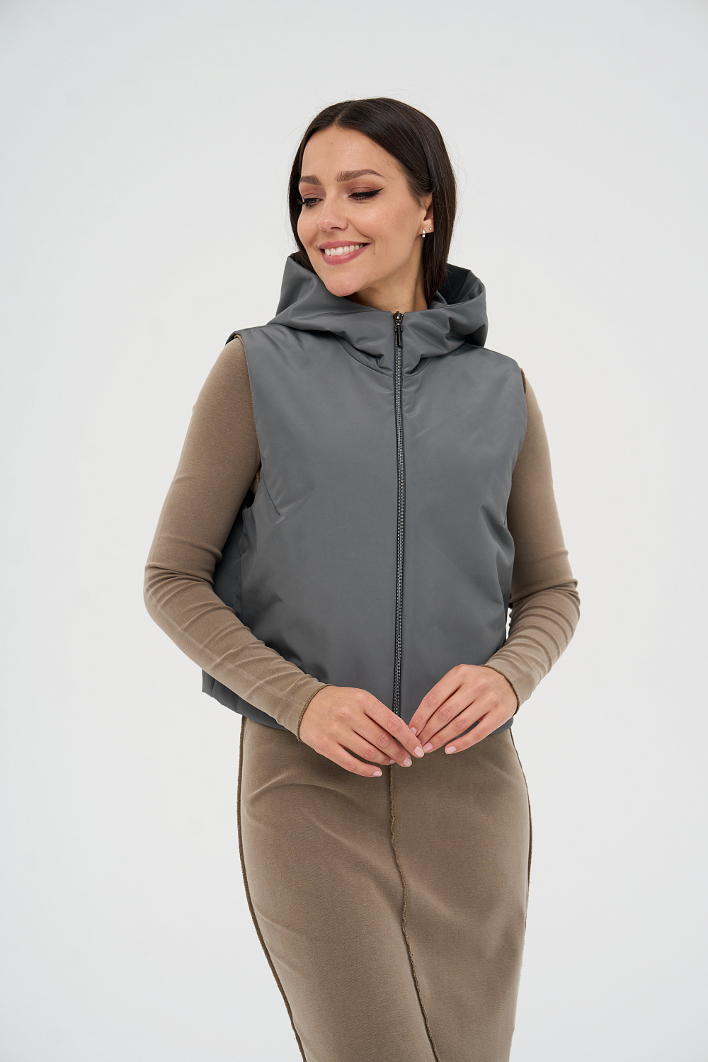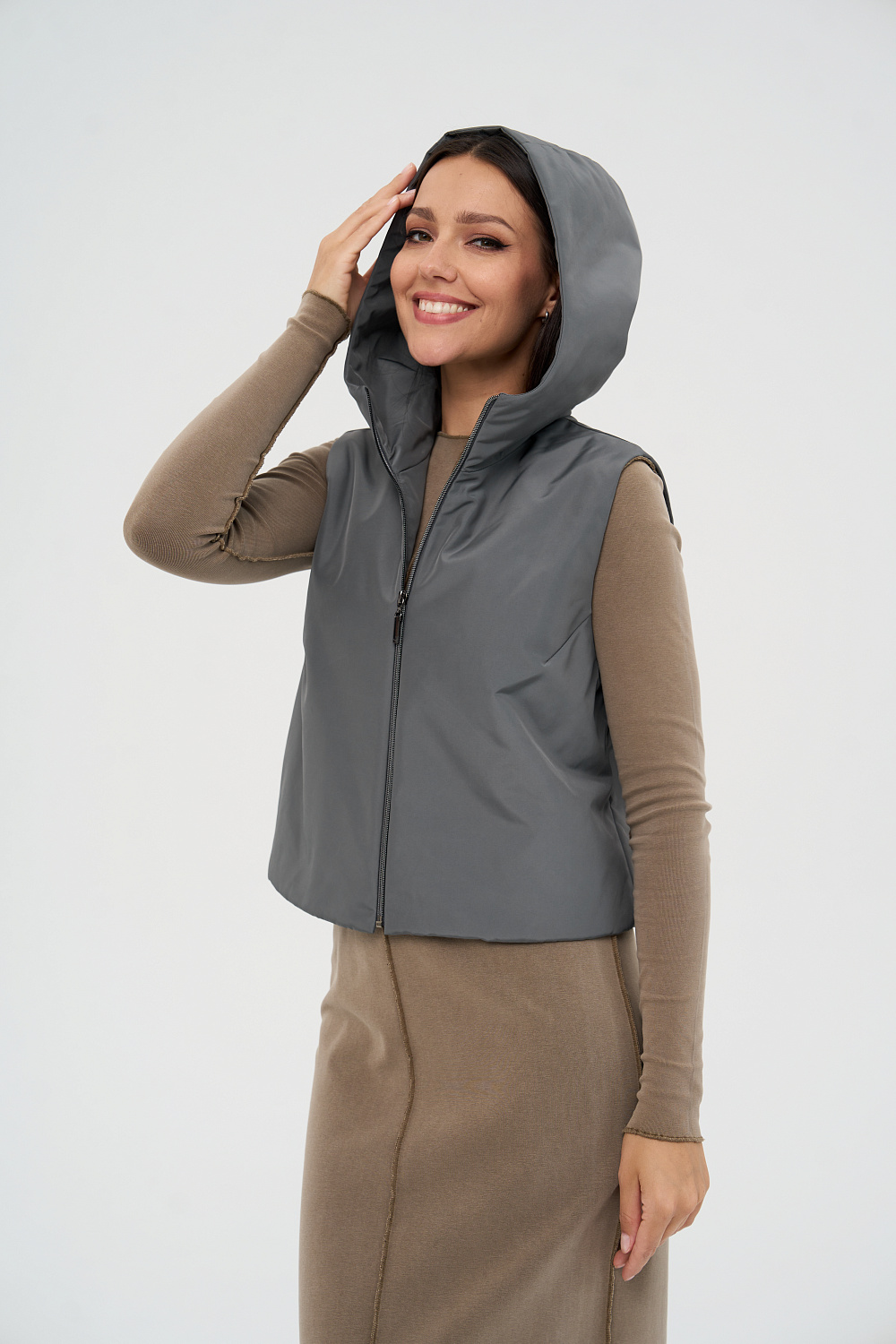 Жилет женский дополнен удобной и элегантной молнией. Капюшон защитит Ваши волосы в дождливую погоду. Универсальный прямой силуэт позволяет носить жилетку, как поверх верхней одежды, так и под Ваше любимое пальто или куртку, в качестве дополнительного утепляющего слоя. В более теплую погоду жилетка прекрасно впишется и в повседневный, и в элегантный образы.