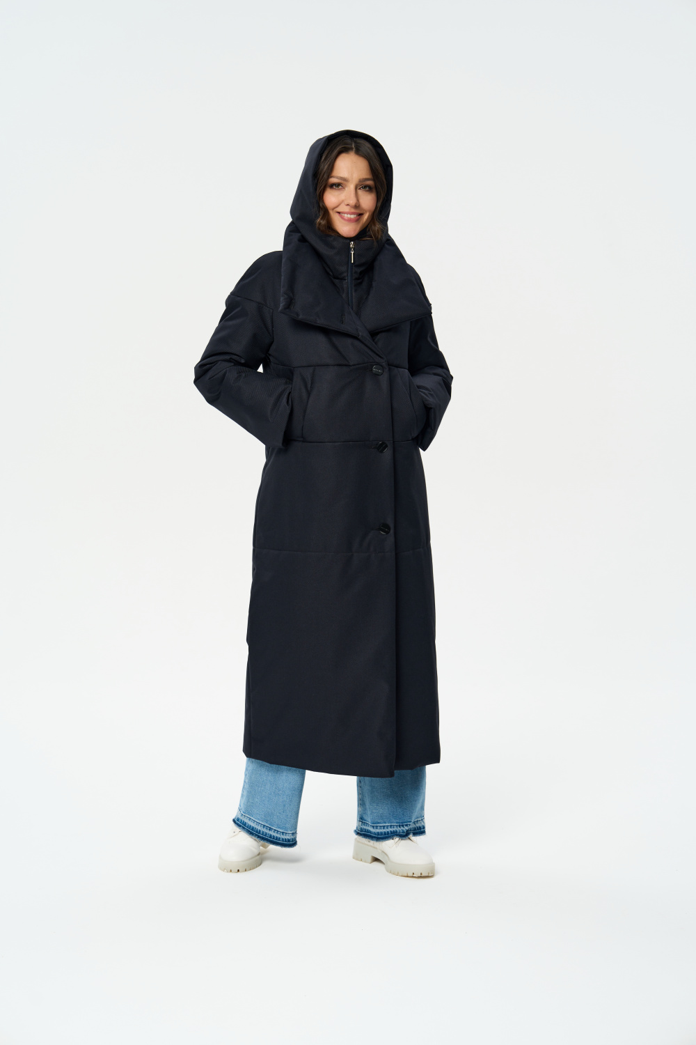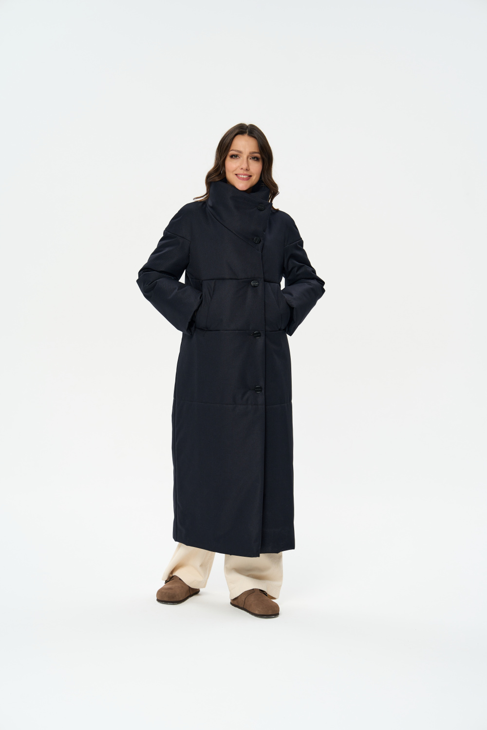 Пальто прямого силуэта, однобортное с застежкой на 5 пуговиц. Воротник стойка - апаш. На полочках обработаны два кармана " листочка ". Длина рукава может регулироваться мягким отворотом.