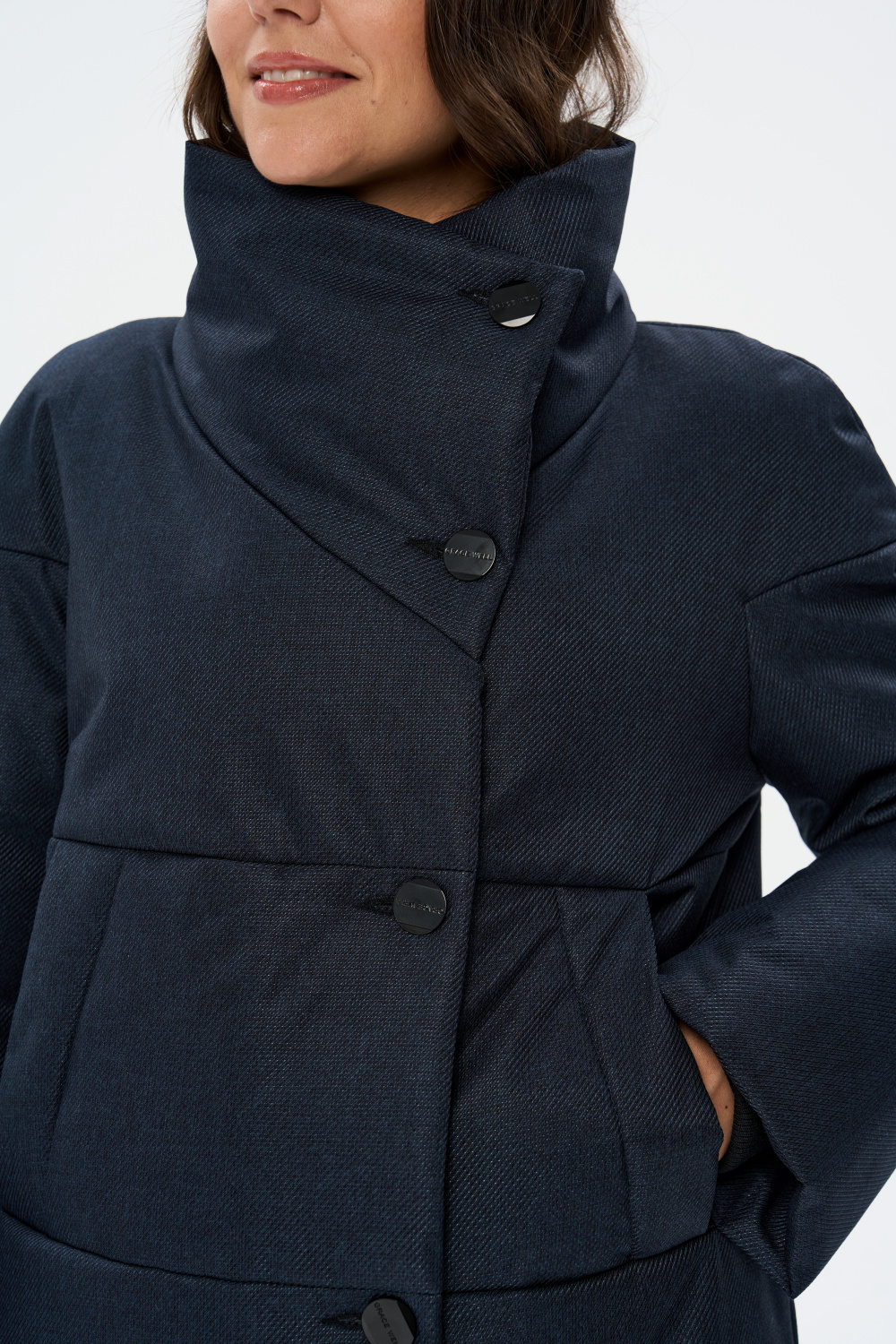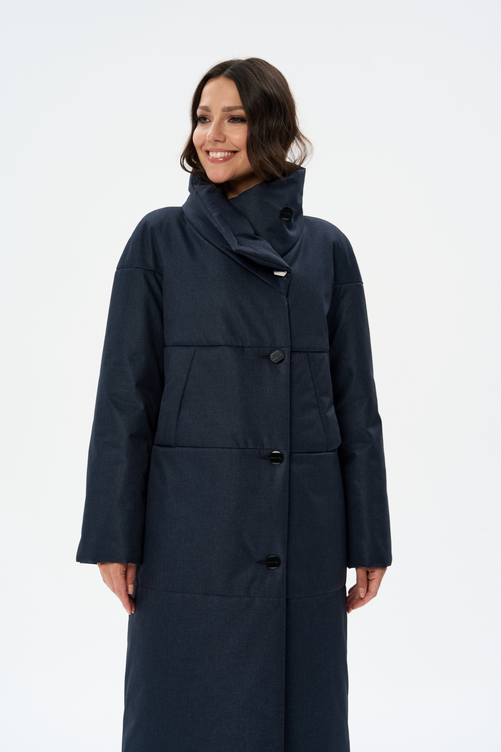 Пальто прямого силуэта, однобортное с застежкой на 5 пуговиц. Воротник стойка - апаш. На полочках обработаны два кармана " листочка ". Длина рукава может регулироваться мягким отворотом.